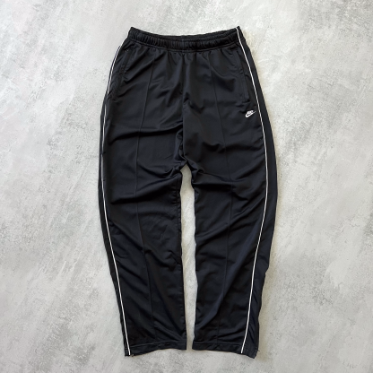 I pantaloni Nike degli anni 2000 rappresentano un'icona di stile sportivo e funzionalità, perfettamente in linea con l'estetica di quel decennio. Realizzati prevalentemente in tessuti tecnici come il nylon o il poliestere, si distinguono per il loro taglio ampio e rilassato, con elastici in vita e alle caviglie che ne accentuano la praticità. Spesso arricchiti da tasche laterali con zip e dettagli riflettenti, questi pantaloni incarnano lo spirito dello streetwear e dell'athleisure di quegli anni. I colori spaziano dal classico nero a tonalità più vivaci, con il logo Nike, ricamato o stampato sulla gamba, che aggiunge un tocco distintivo e riconoscibile.