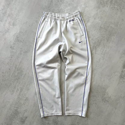 I pantaloni Nike degli anni 2000 rappresentano un'icona di stile sportivo e funzionalità, perfettamente in linea con l'estetica di quel decennio. Realizzati prevalentemente in tessuti tecnici come il nylon o il poliestere, si distinguono per il loro taglio ampio e rilassato, con elastici in vita e alle caviglie che ne accentuano la praticità. Spesso arricchiti da tasche laterali con zip e dettagli riflettenti, questi pantaloni incarnano lo spirito dello streetwear e dell'athleisure di quegli anni. I colori spaziano dal classico nero a tonalità più vivaci, con il logo Nike, ricamato o stampato sulla gamba, che aggiunge un tocco distintivo e riconoscibile.