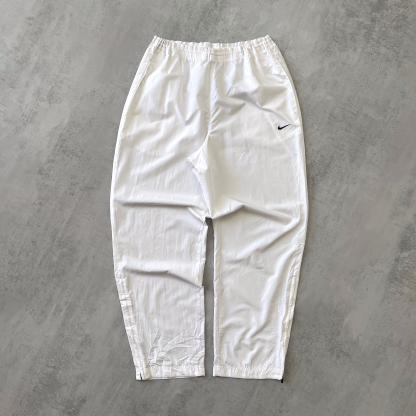 I pantaloni Nike degli anni 2000 rappresentano un'icona di stile sportivo e funzionalità, perfettamente in linea con l'estetica di quel decennio. Realizzati prevalentemente in tessuti tecnici come il nylon o il poliestere, si distinguono per il loro taglio ampio e rilassato, con elastici in vita e alle caviglie che ne accentuano la praticità. Spesso arricchiti da tasche laterali con zip e dettagli riflettenti, questi pantaloni incarnano lo spirito dello streetwear e dell'athleisure di quegli anni. I colori spaziano dal classico nero a tonalità più vivaci, con il logo Nike, ricamato o stampato sulla gamba, che aggiunge un tocco distintivo e riconoscibile.