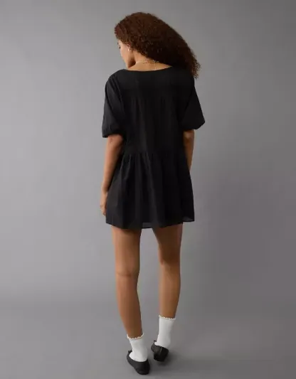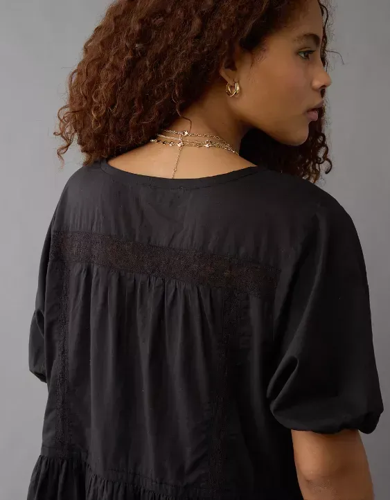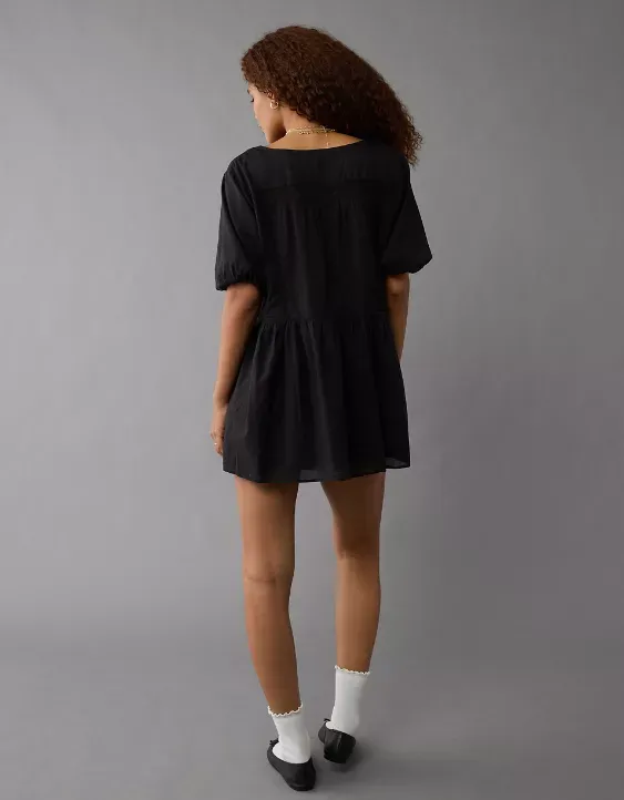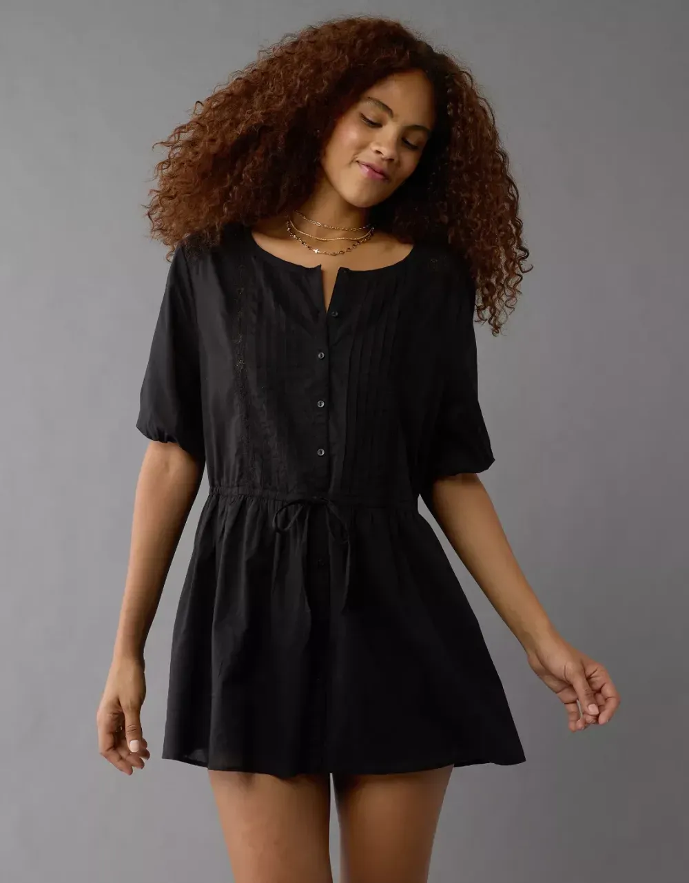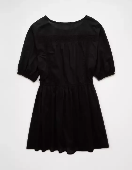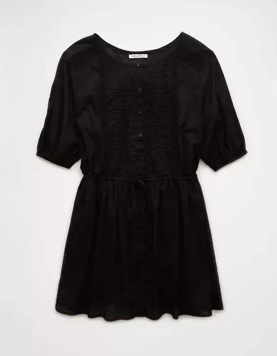 A perfectly boho chic, peasant blouse-inspired dress, featuring a puffy 3/4 sleeve and a tie to snatch your waist.