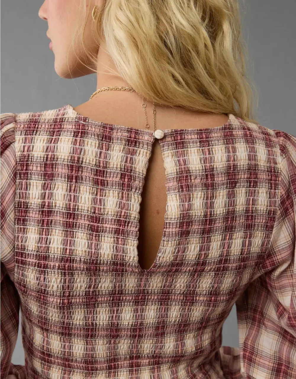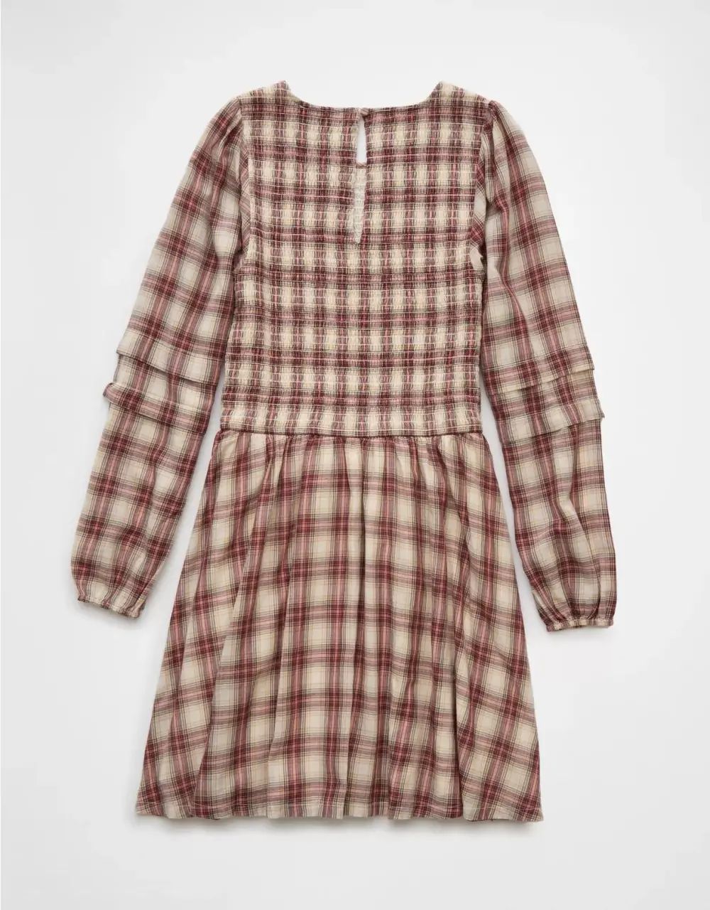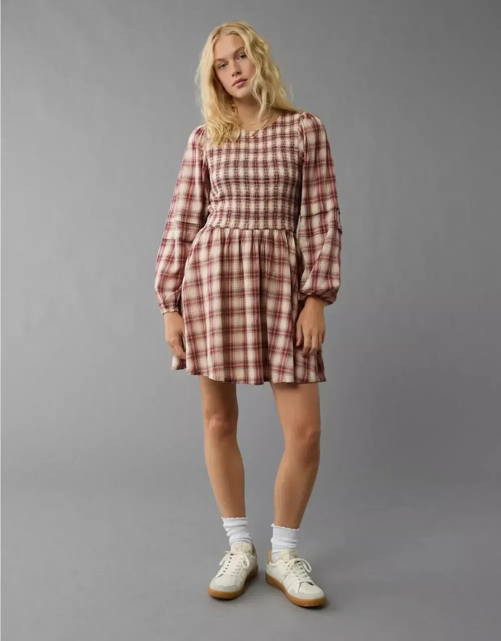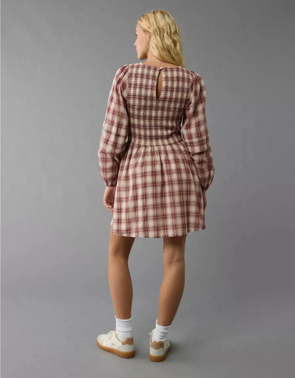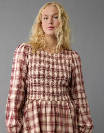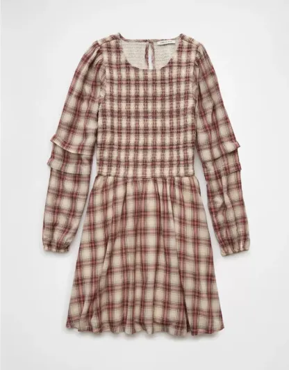 Ae Long-Sleeve High Neck Plaid Mini Dress