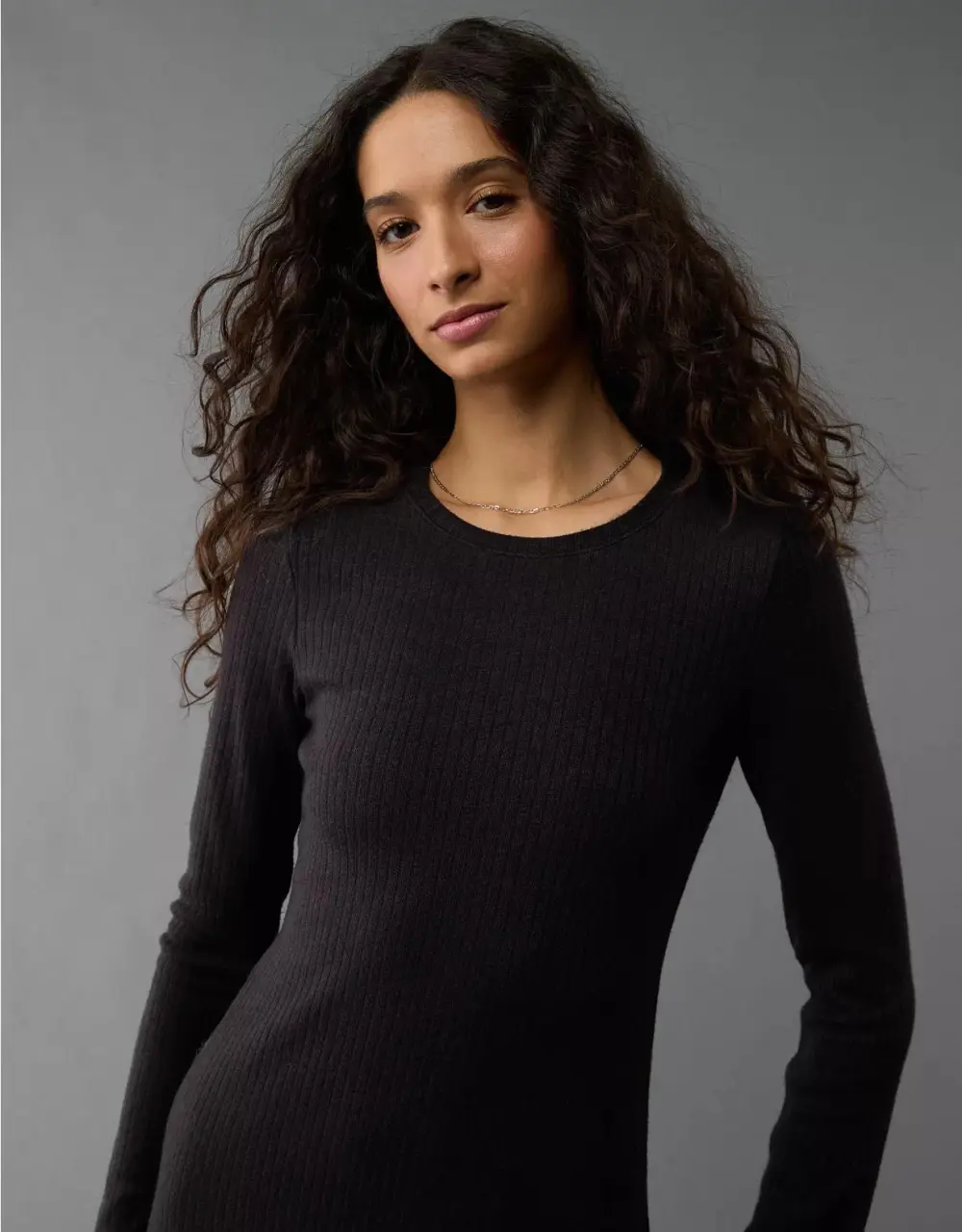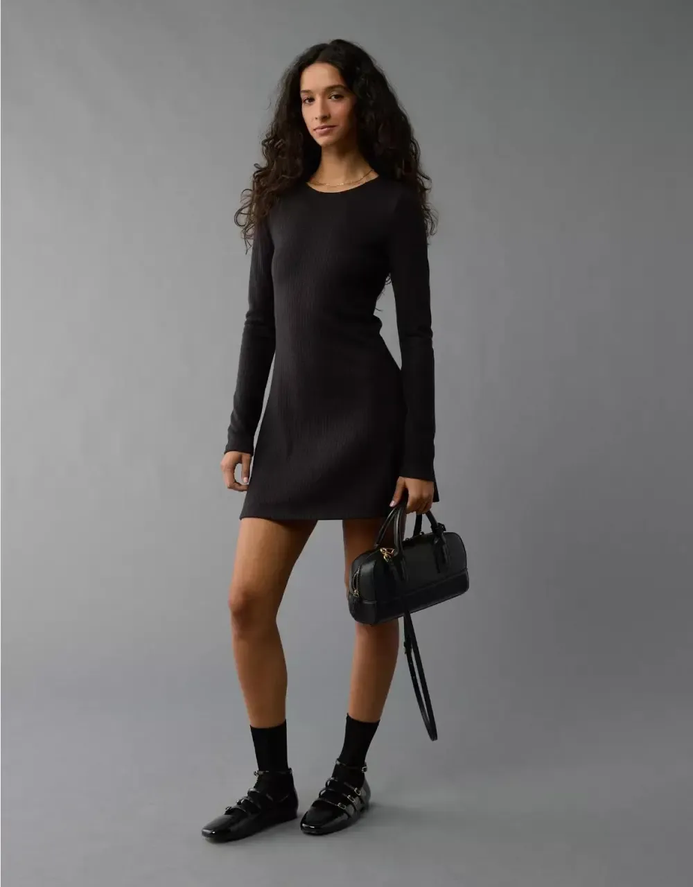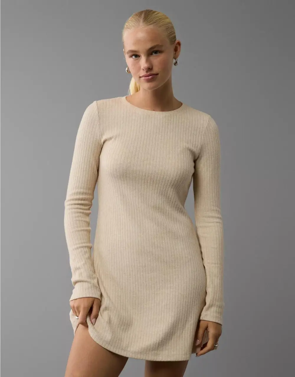 Ae Long-Sleeve Ribbed Fit & Flare Mini Dress