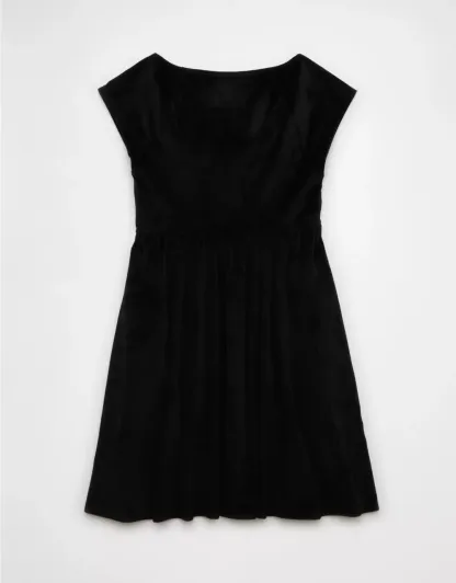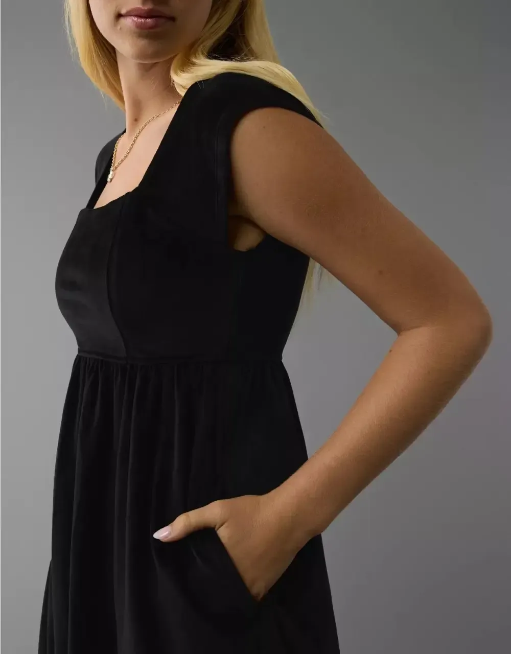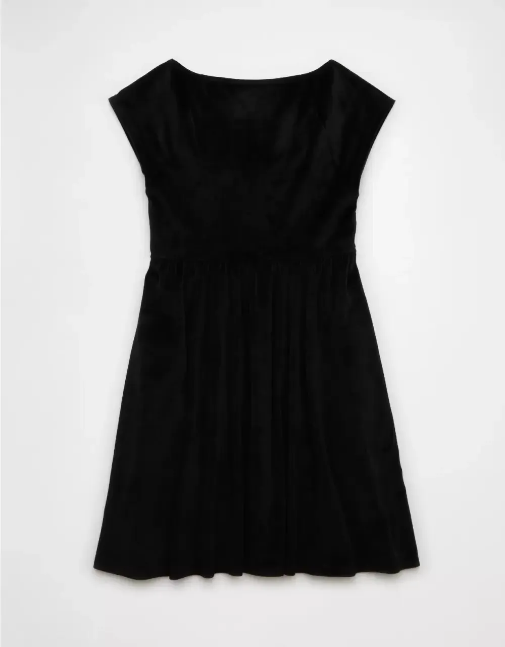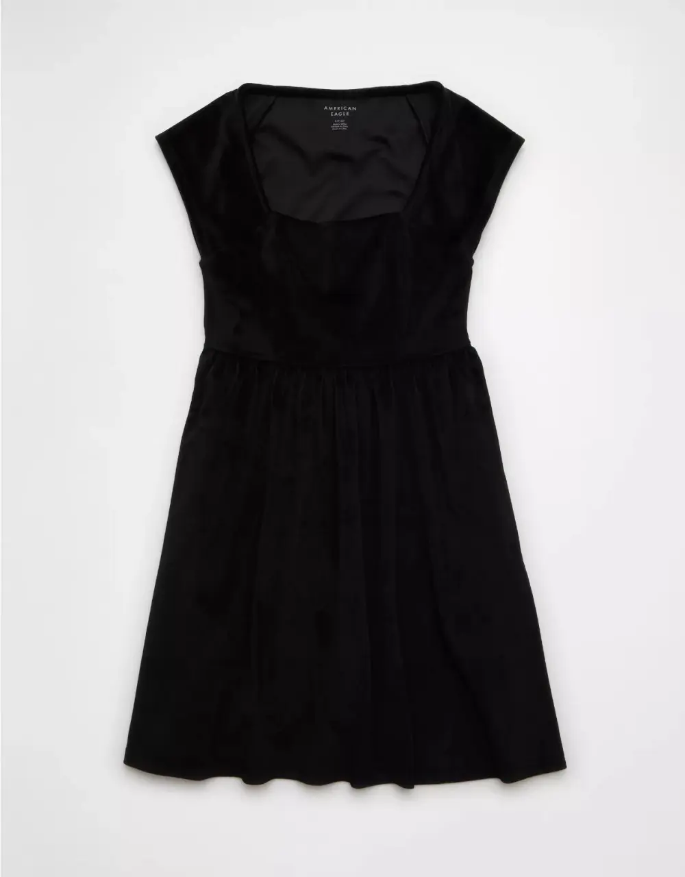 A holiday-ready dress, featuring a sleek, modern square neck and festive, cozy velvet.