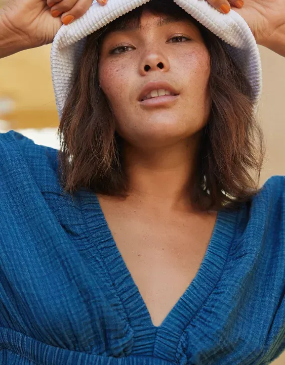 The famous breezy feel of Pool-To-Party levels up once again. Say hello to your new fave mini dress: flutter sleeves & a deep v neckline are here to start the party.