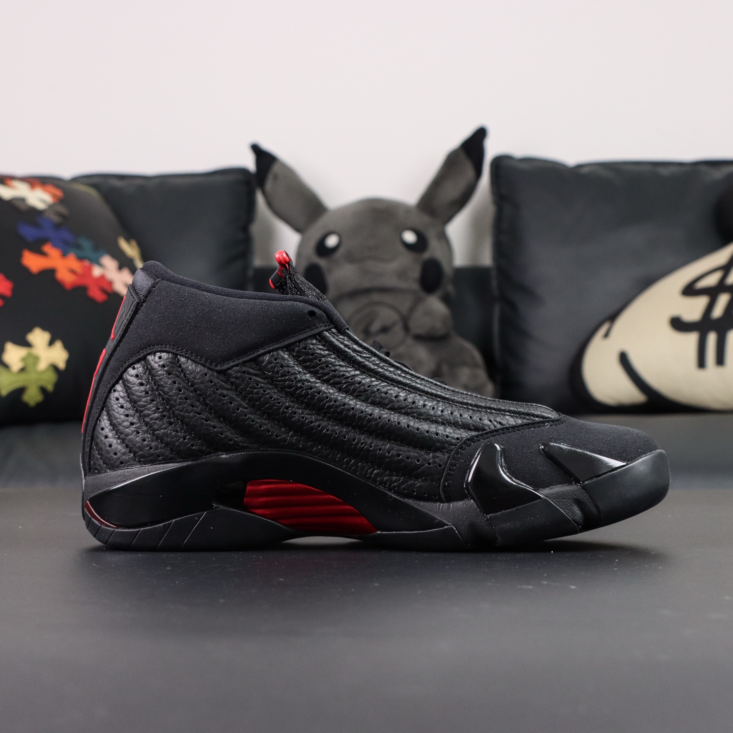 The Jordan 14 Last Shot reps use the classic black-and-red look from the 1998 Finals. The upper comes in black leather with small red hits on the tongue, heel, and midsole. The details follow the Ferrari-inspired design that makes the AJ14 easy to recognize.