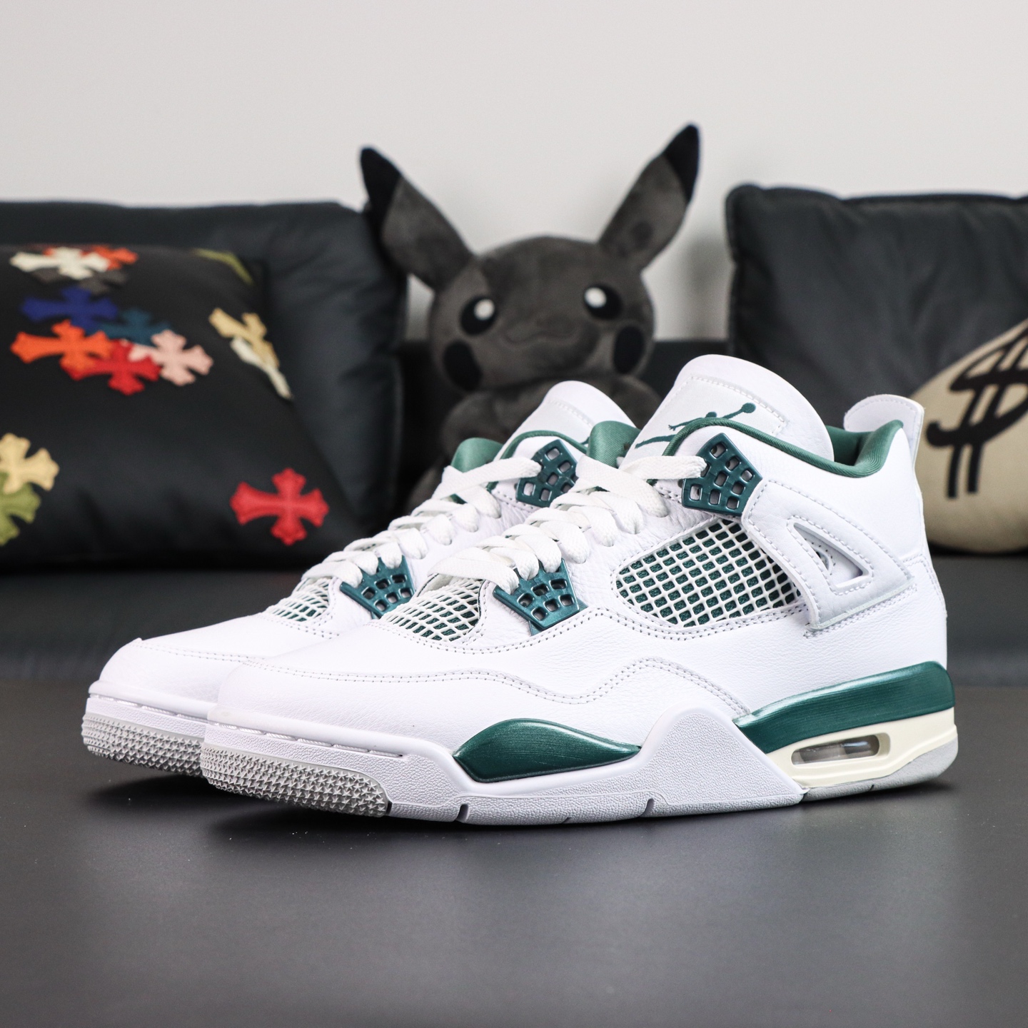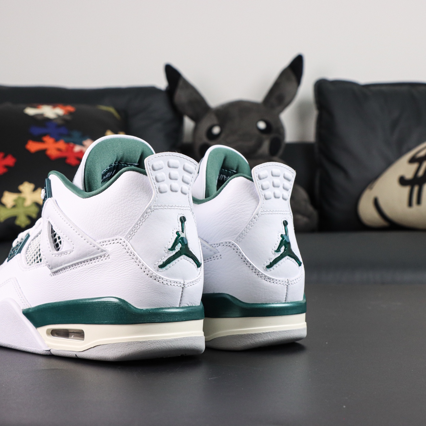 The Jordan 4 Oxidized Green reps feature a premium white leather upper with vibrant green accents, creating a bold and clean look that enhances the iconic Air Jordan 4 silhouette. This replica brings an updated retro design, highlighting green details on the mudguard, eyelets, and outsole to make the sneaker pop.