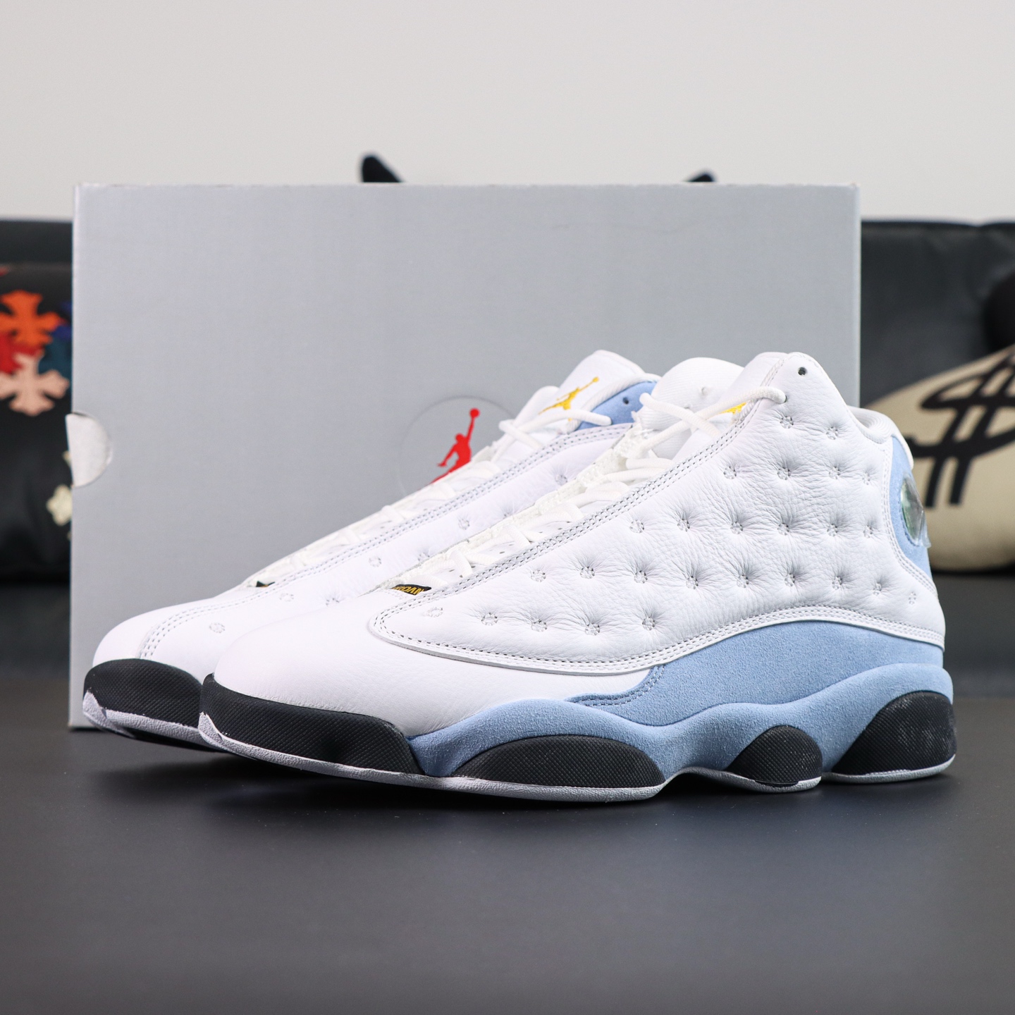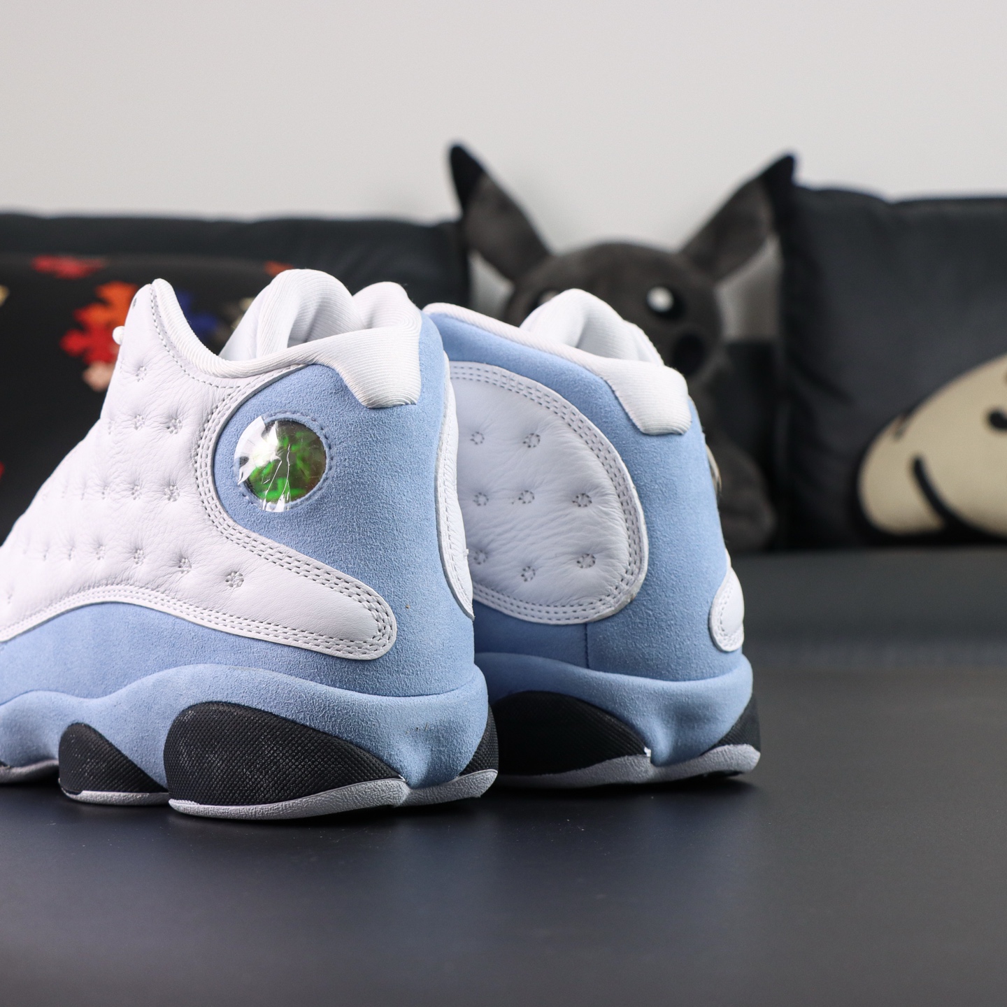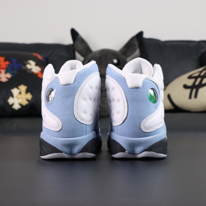 The Air Jordan 13 Retro Blue Grey Reps showcase a refreshing twist on the legendary Jordan 13 silhouette. With a clean white leather base and soft blue-grey suede overlays, the design balances subtle elegance with street-ready appeal. The signature paw-like midsole and holographic “panther eye” heel badge remain true to the heritage of the Jordan 13.