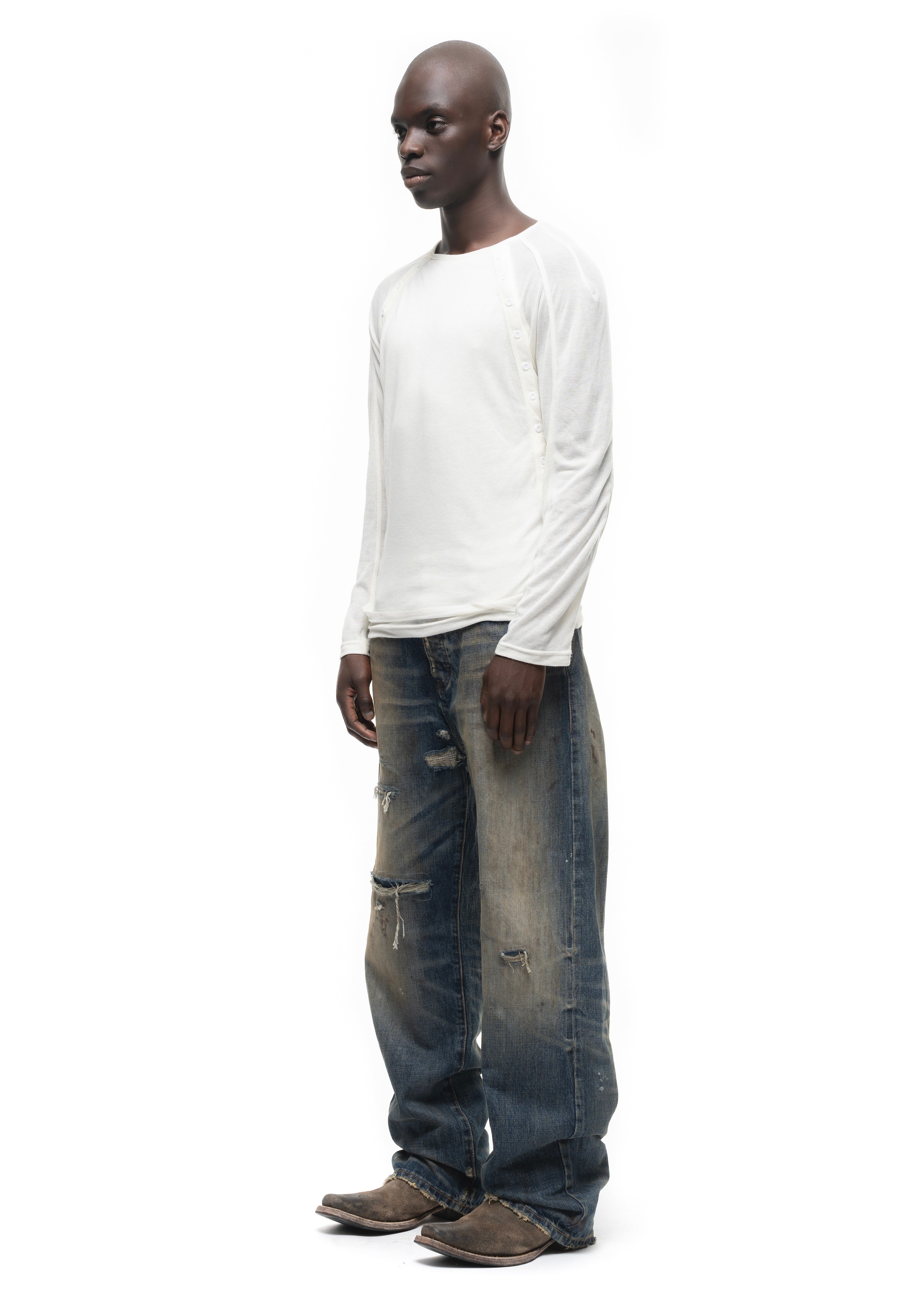 A LOOSE, HEAVY DENIM WITH HAND-APPLIED FADING AND CRAFTED DISTRESSING. THE SOFT, WASHED FINISH AND NATURAL DRAPE EMPHASIZE THE WEIGHT AND TEXTURE OF THE FABRIC.