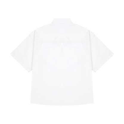 poplin fabric / 70% cotton 30% polyester / embroidery on front / custom buttons / curved hem / relaxed fit / fits true to size