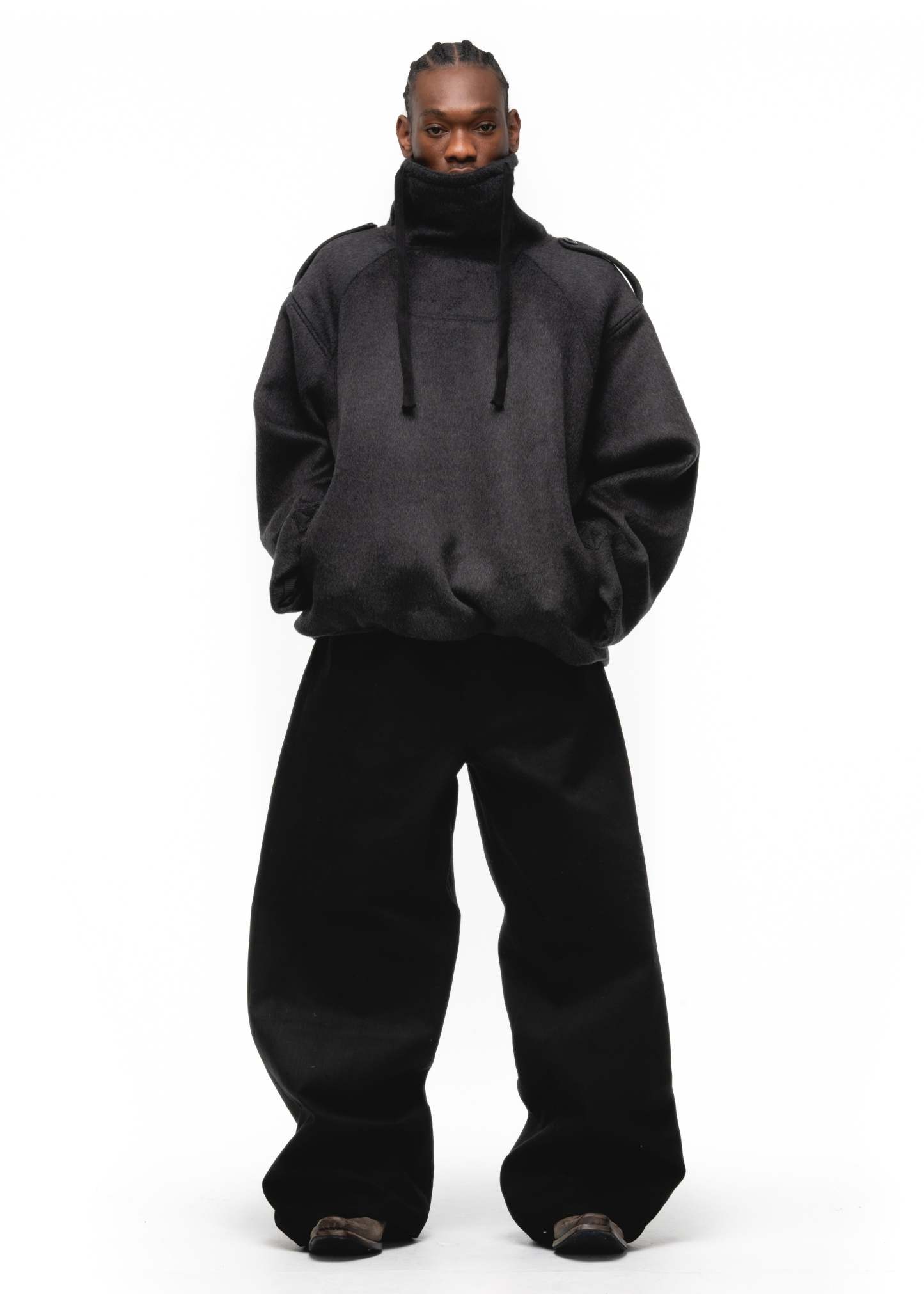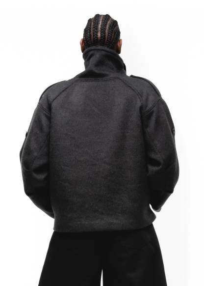 DESIGNED FOR BOTH STYLE AND FUNCTION, THIS HEAVY WOOL SWEATER JACKET FEATURES A WIDE FIT, MILITARY SHOULDER FLAPS, AND A HIGH COLLAR FOR A BOLD, STRUCTURED LOOK. THE WAFFLE INTERIOR PROVIDES EXTRA WARMTH, MAKING IT PERFECT FOR COLD DAYS. AVAILABLE IN BLACK, GREY, AND EARTH GREEN.