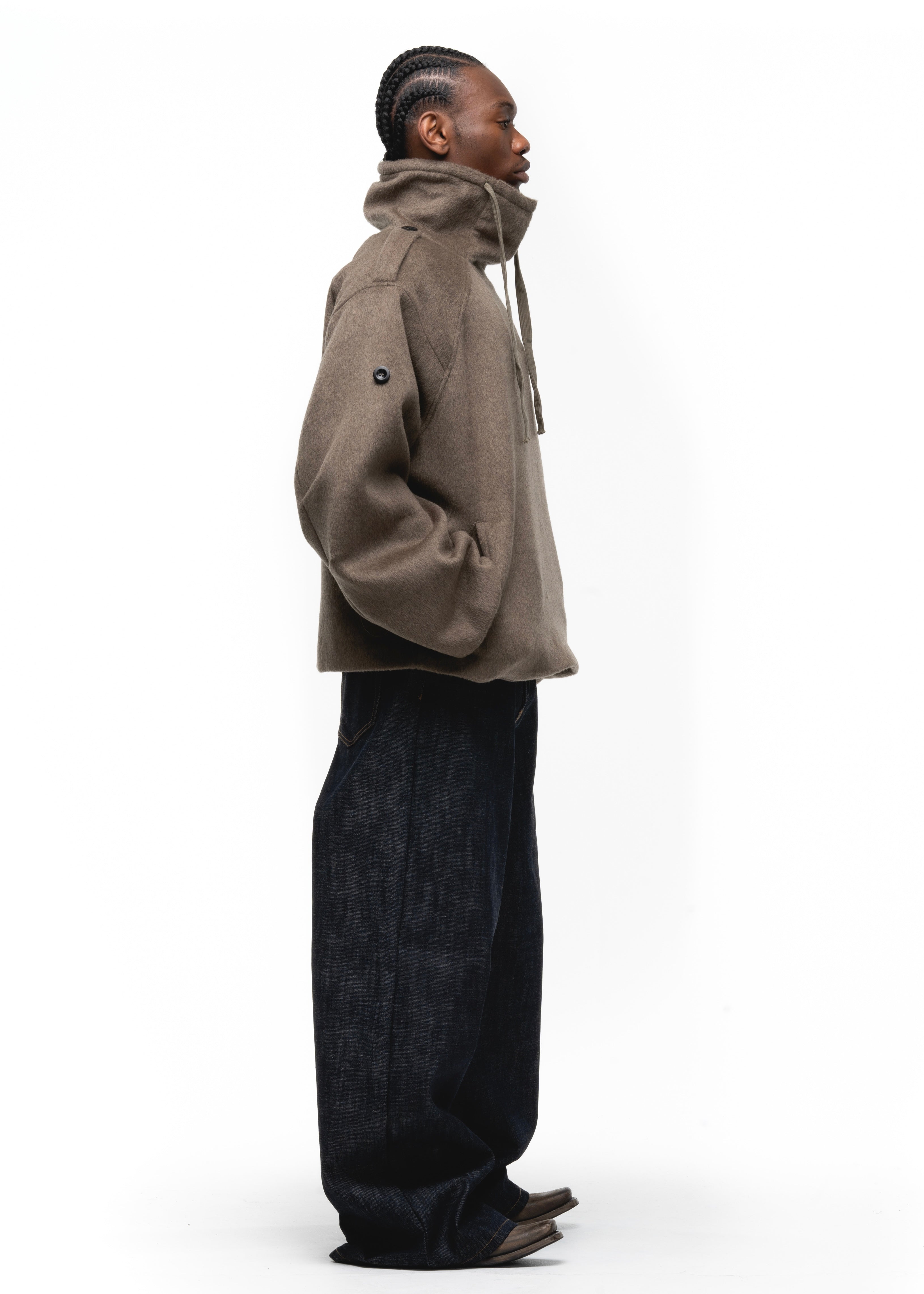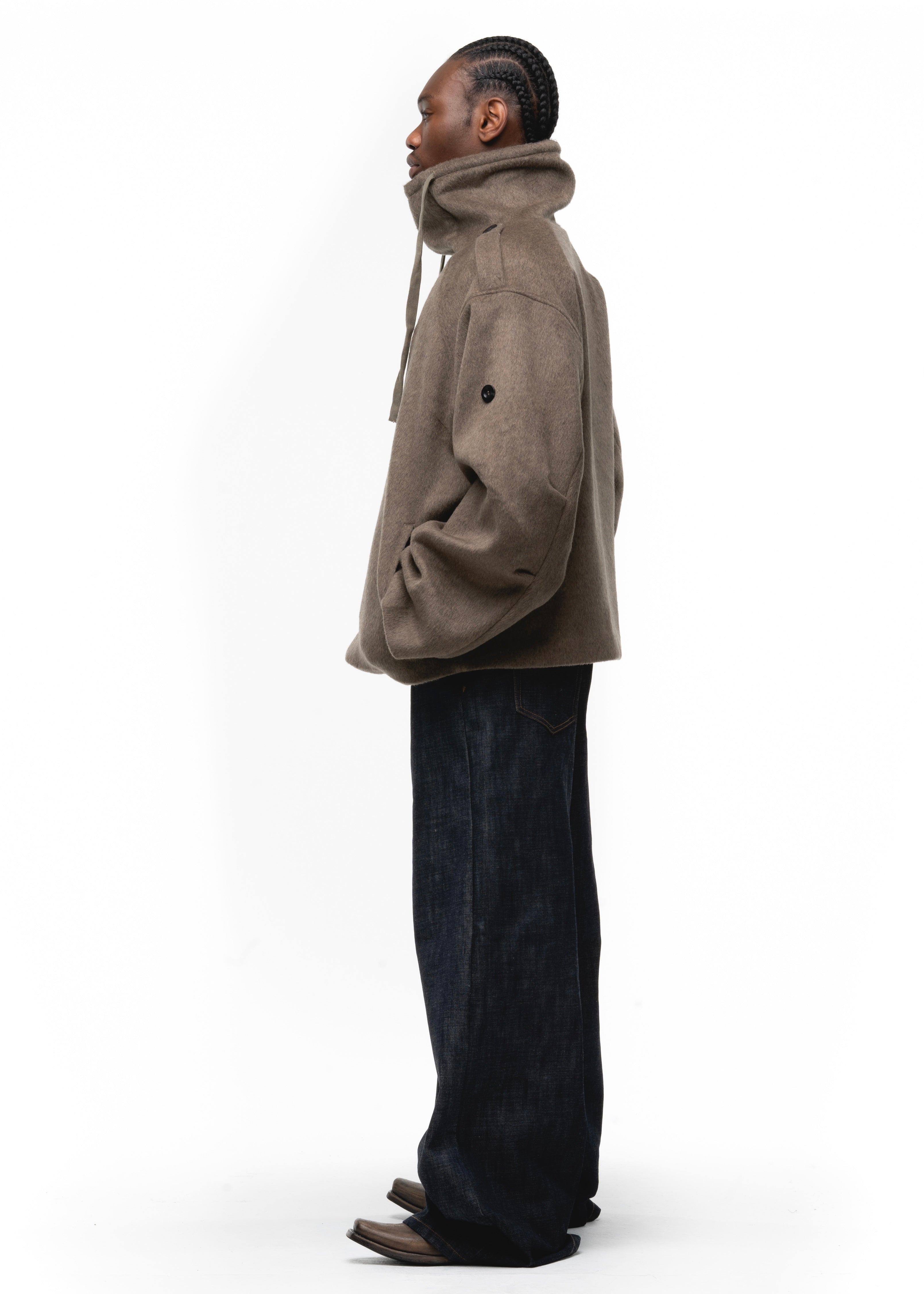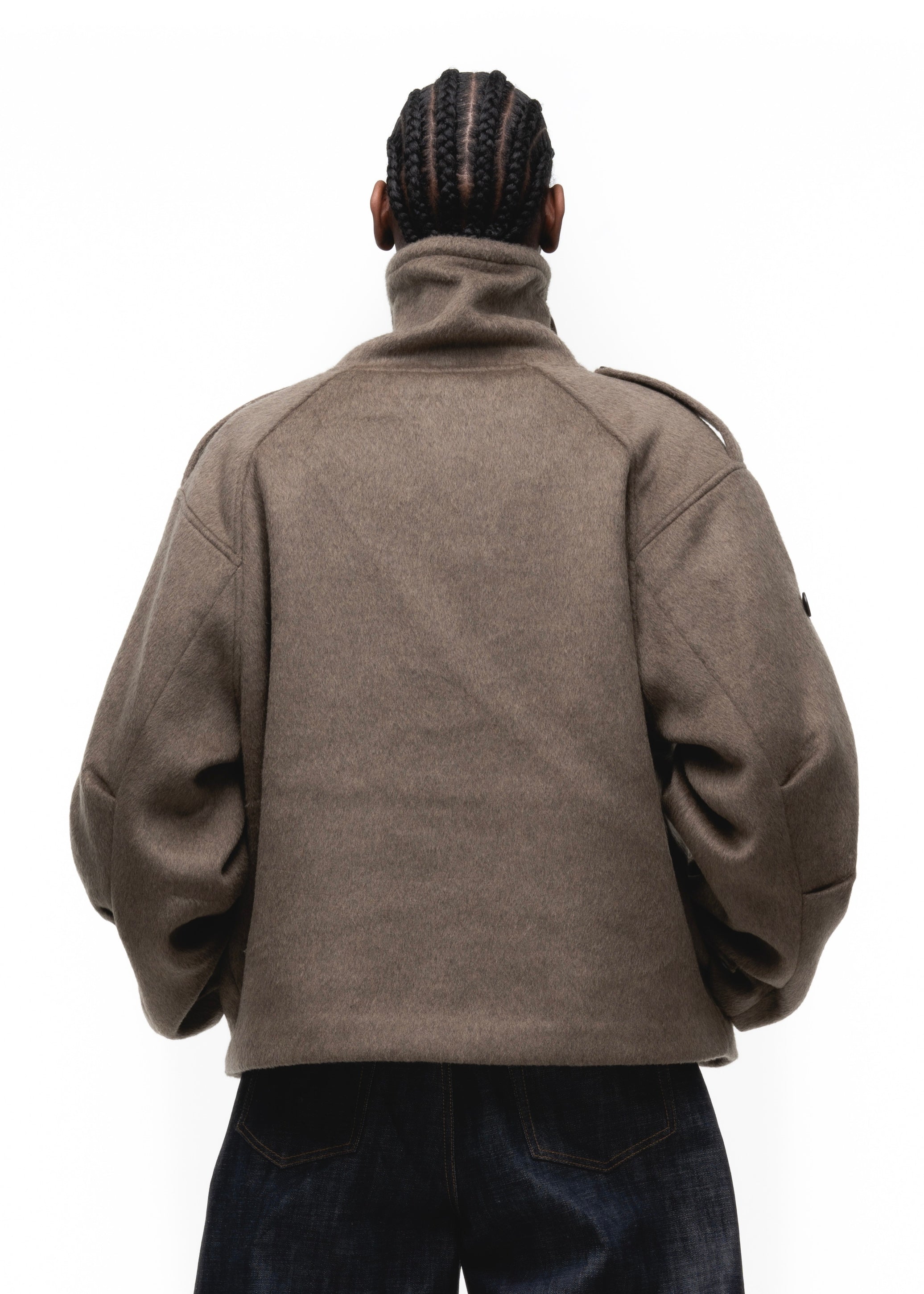 DESIGNED FOR BOTH STYLE AND FUNCTION, THIS HEAVY WOOL SWEATER JACKET FEATURES A WIDE FIT, MILITARY SHOULDER FLAPS, AND A HIGH COLLAR FOR A BOLD, STRUCTURED LOOK. THE WAFFLE INTERIOR PROVIDES EXTRA WARMTH, MAKING IT PERFECT FOR COLD DAYS. AVAILABLE IN BLACK, GREY, AND EARTH GREEN.