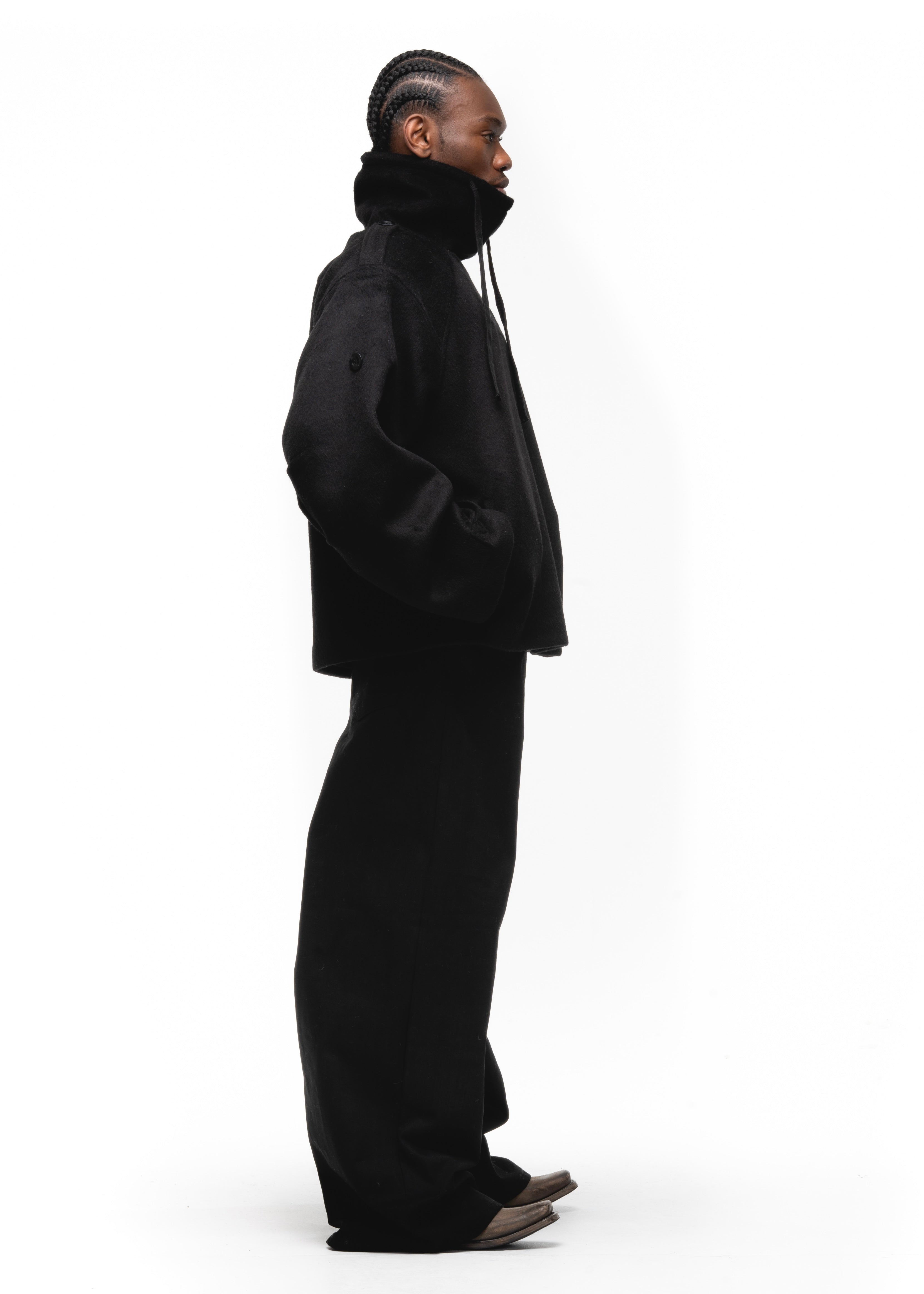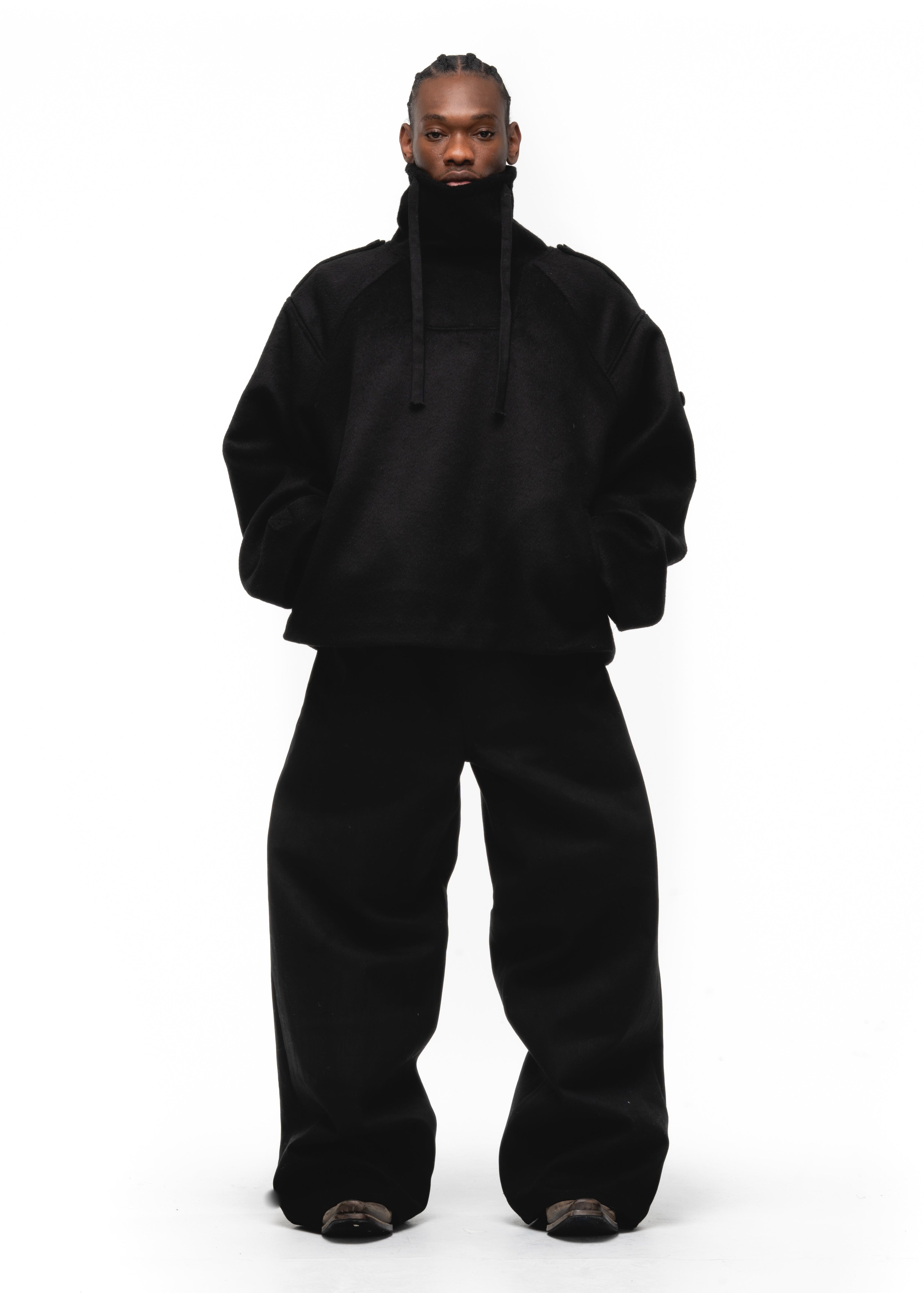 DESIGNED FOR BOTH STYLE AND FUNCTION, THIS HEAVY WOOL SWEATER JACKET FEATURES A WIDE FIT, MILITARY SHOULDER FLAPS, AND A HIGH COLLAR FOR A BOLD, STRUCTURED LOOK. THE WAFFLE INTERIOR PROVIDES EXTRA WARMTH, MAKING IT PERFECT FOR COLD DAYS. AVAILABLE IN BLACK, GREY, AND EARTH GREEN.