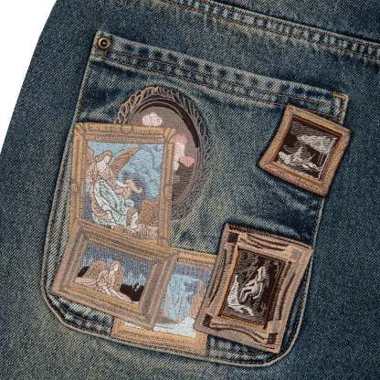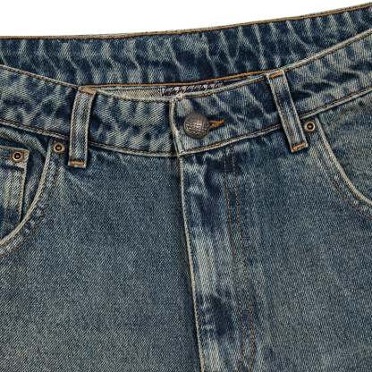 14,5oz washed denim (slighty distressed) / 100% cotton / embroidered back pockets (unusable back pockets) / embroidered leather patch / custom button / baggy fit / fits true to size