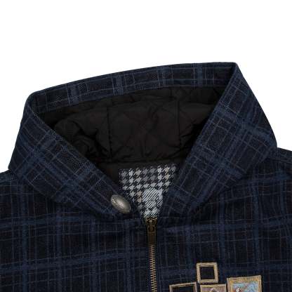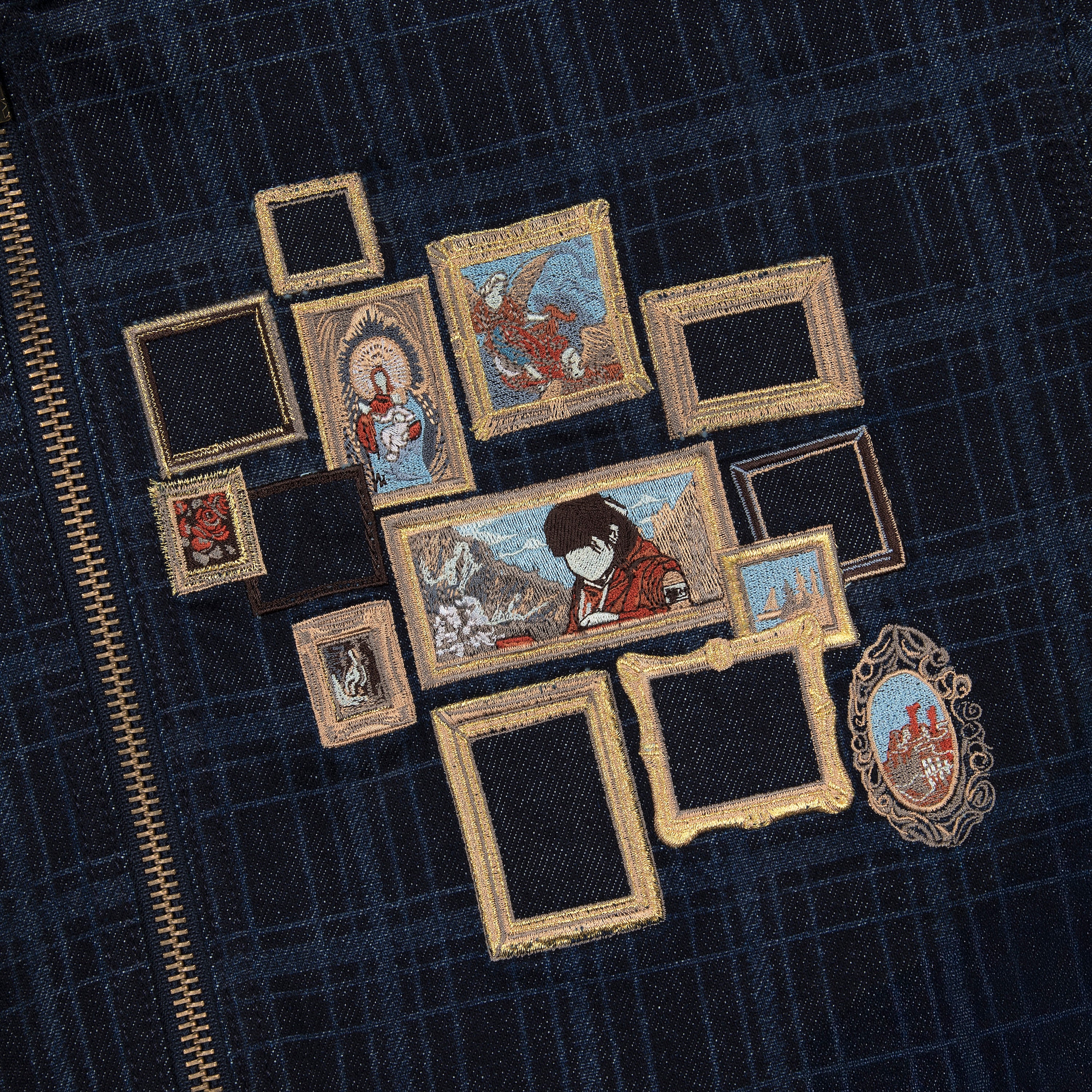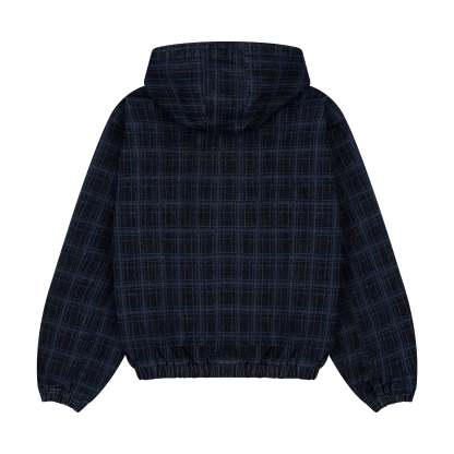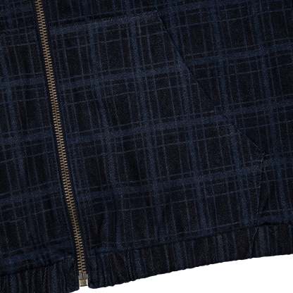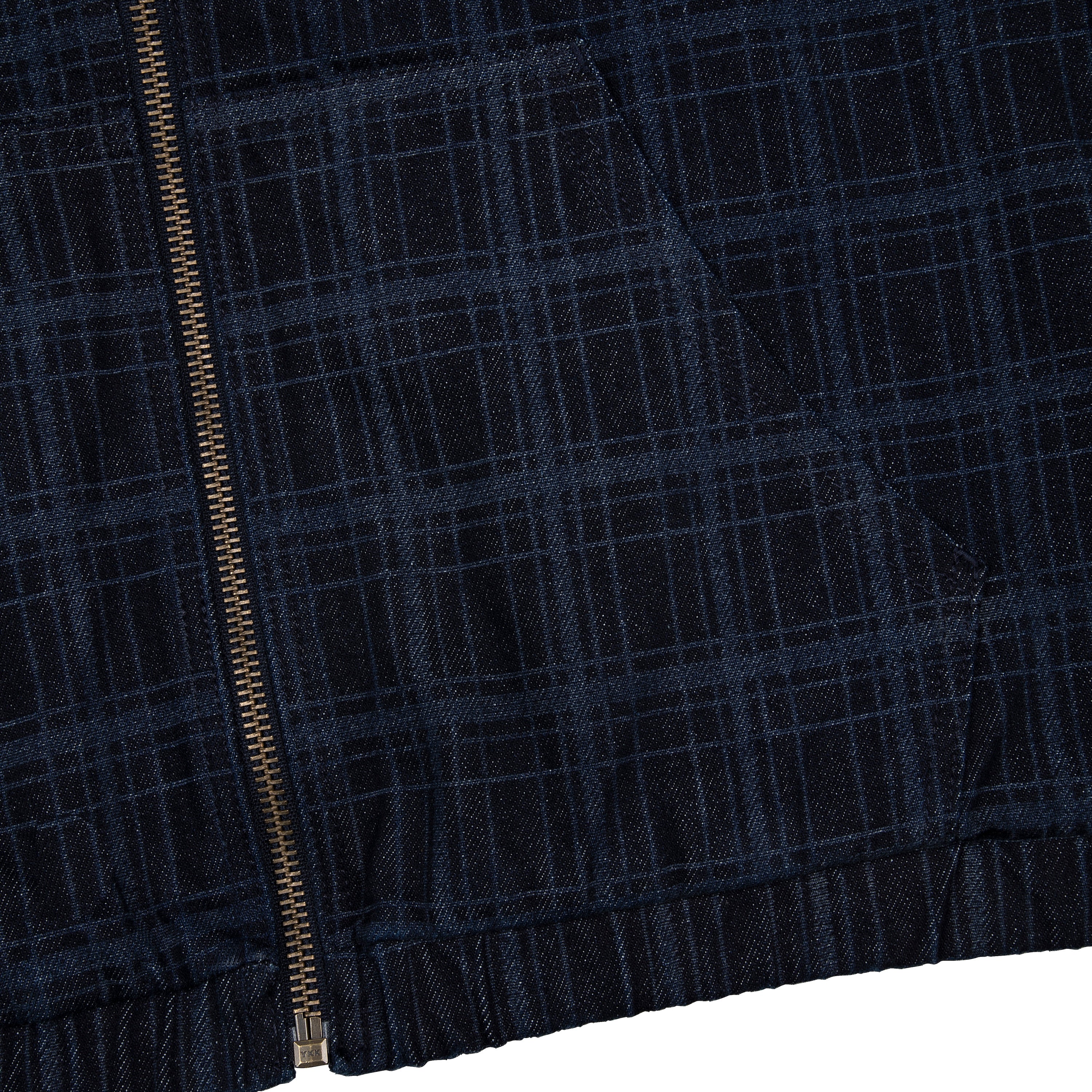14oz raw denim / 100% cotton / plaid patterned laser printed fabric / embroidery on front with appliqué made from raw denim / pin on collar / with YKK zipper / fits true to size