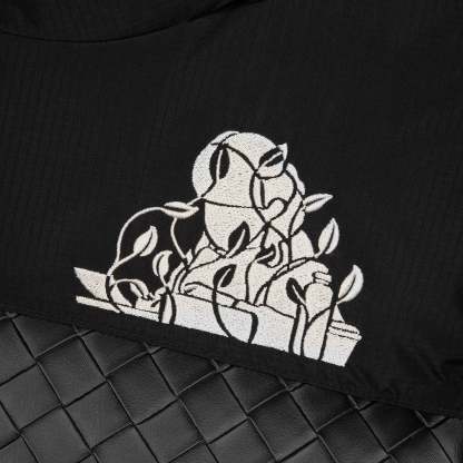 parachute fabric / 100% polyester / vegan woven leather / down feather filling / embroidery on front and back / with YKK zipper / fits true to size