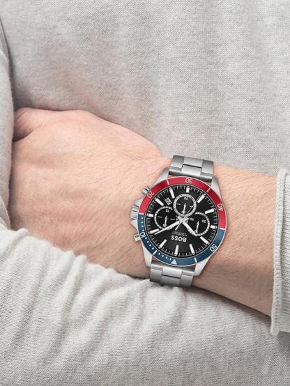 BOSS gents chronograph from the Troper family. Featuring a 44mm stainless steel case, blue and red bezel with black dial, stainless steel bracelet. Water resistant to 5ATM.