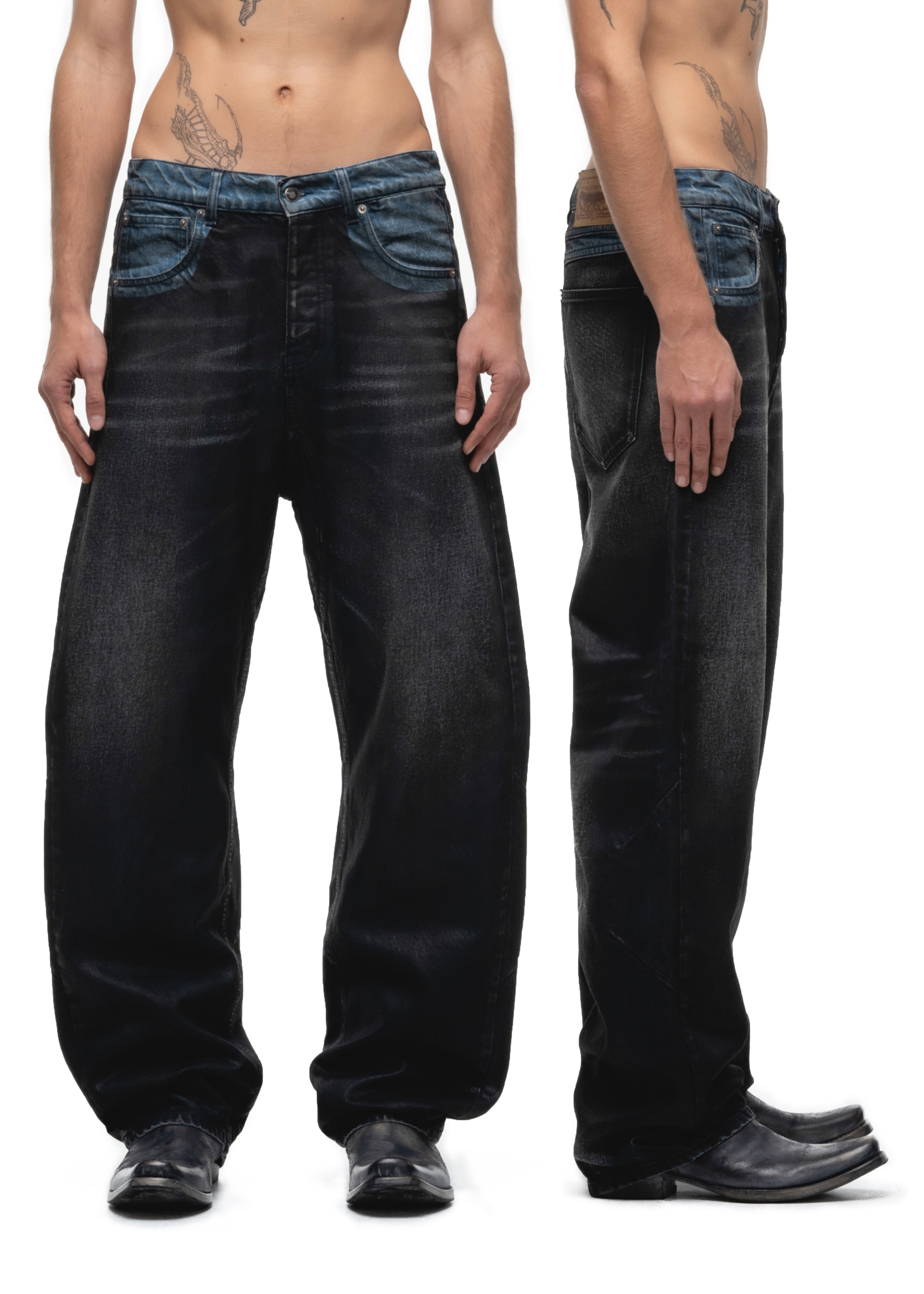 THE DULL BLACK CUT IS AN ITALIAN 5-POCKET DENIM, DESIGNED WITH A DISTINCT BLACK PATINA EFFECT THAT CREATES A SUBTLE, MUTED FINISH. THE WORN-IN TEXTURE AND FADED UNDERTONES GIVE THESE BLACK DENIM PANTS A SOPHISTICATED, UNDERSTATED LOOK. IT FEATURES A CANVAS TAG AND A PRINTED INSIDE POCKET LINING.