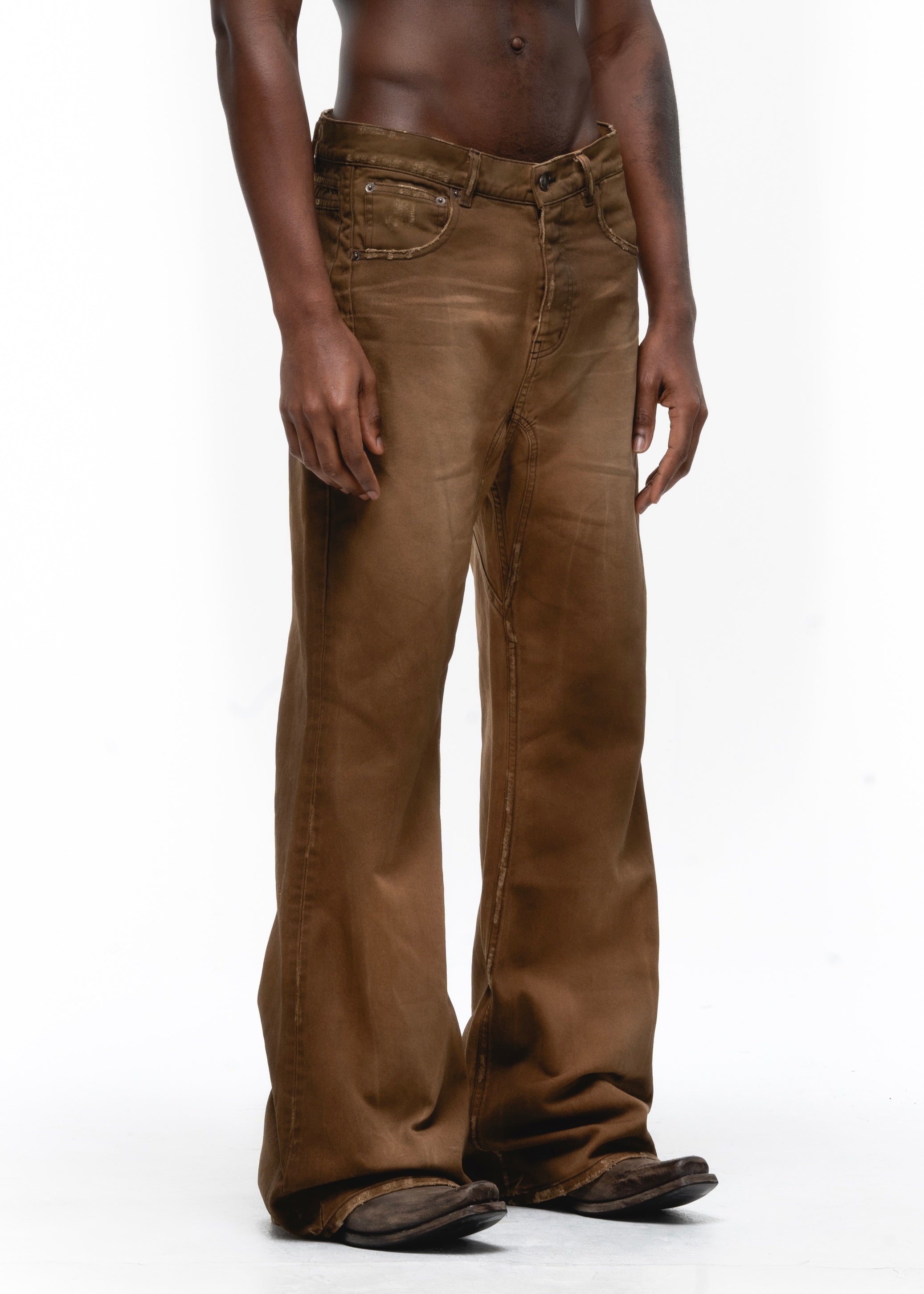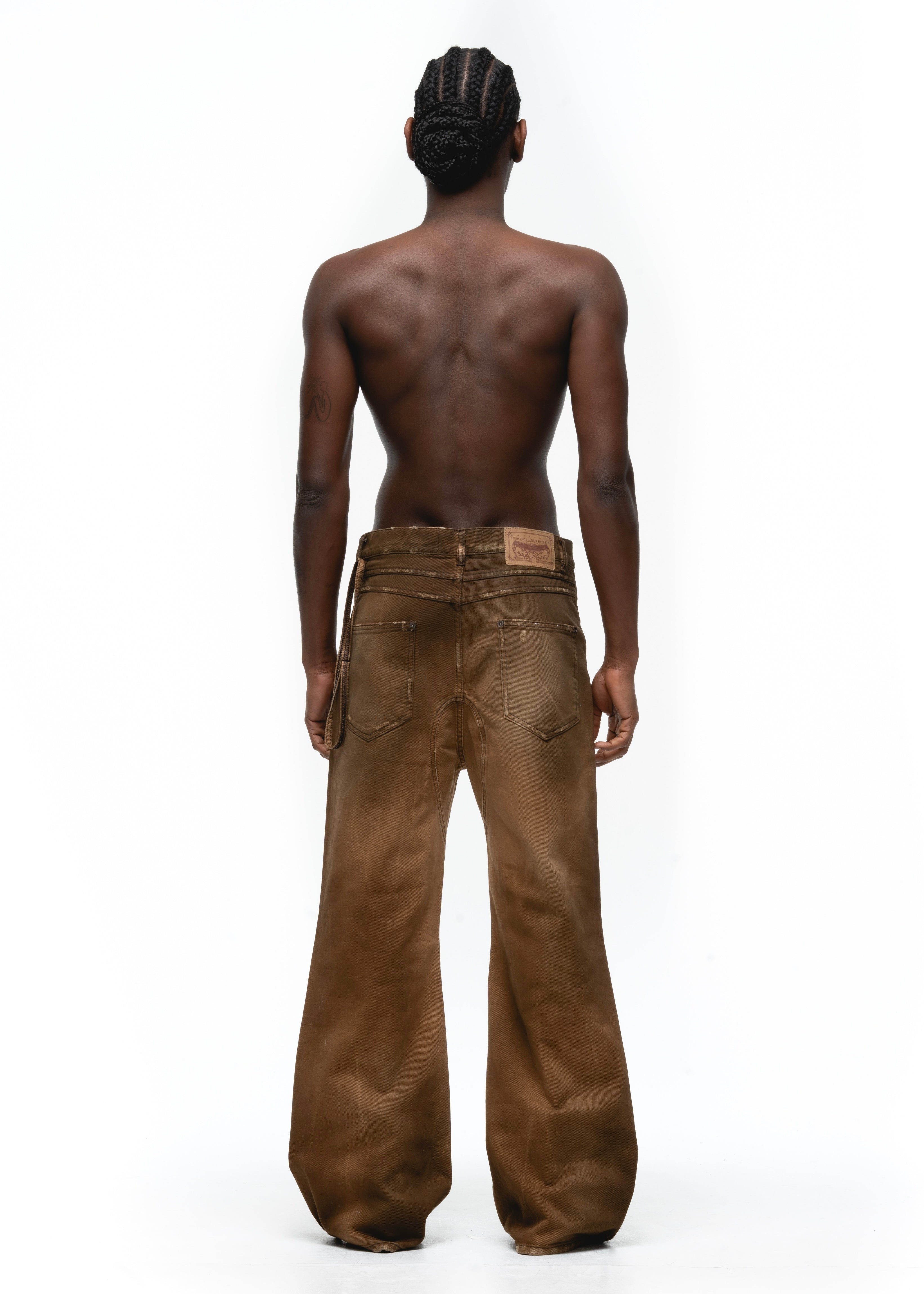 THE RUSTED EARTH CUT IS AN ITALIAN 5-POCKET FLARED DENIM, CRAFTED WITH A UNIQUE NATURAL EARTH TREATMENT. USING MINERAL-RICH CLAYS AND NATURAL PIGMENTS, THE FABRIC DEVELOPS A DISTINCTIVE, ORGANIC PATINA THAT ENHANCES ITS TEXTURE AND DEPTH.
