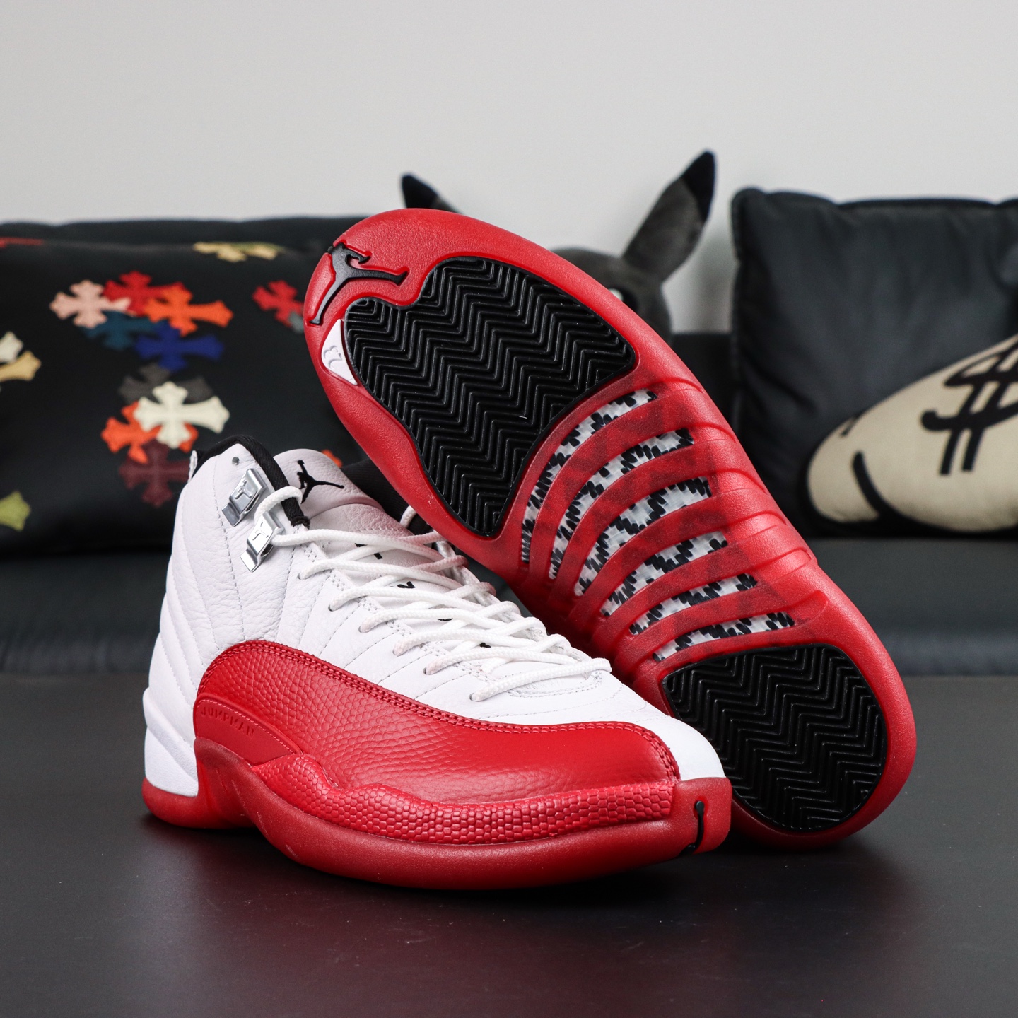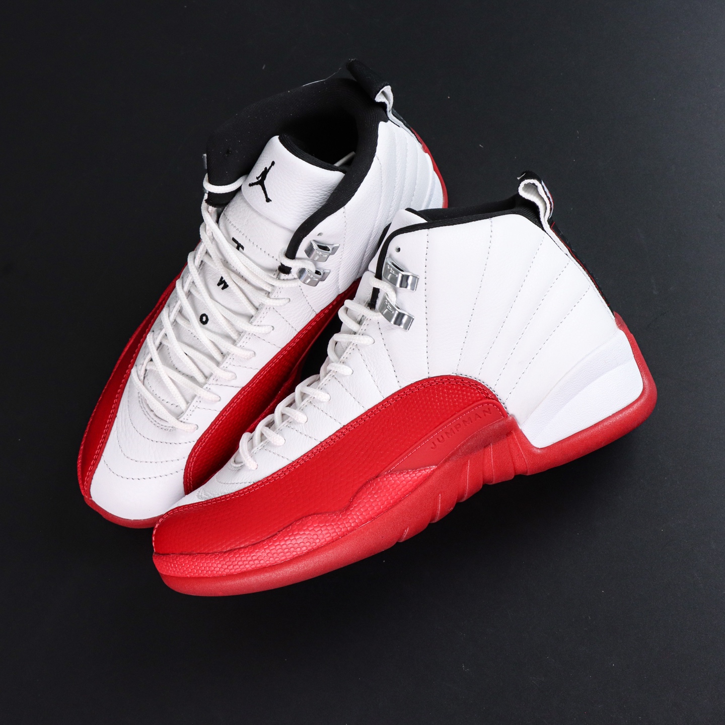 The Jordan 12 Cherry reps bring back one of the most iconic colorways in the Air Jordan line. First introduced in 1997 and re-released in 2023, the Cherry edition features a clean white upper built from tumbled leather, contrasted with bold varsity red on the mudguard, midsole, and outsole.