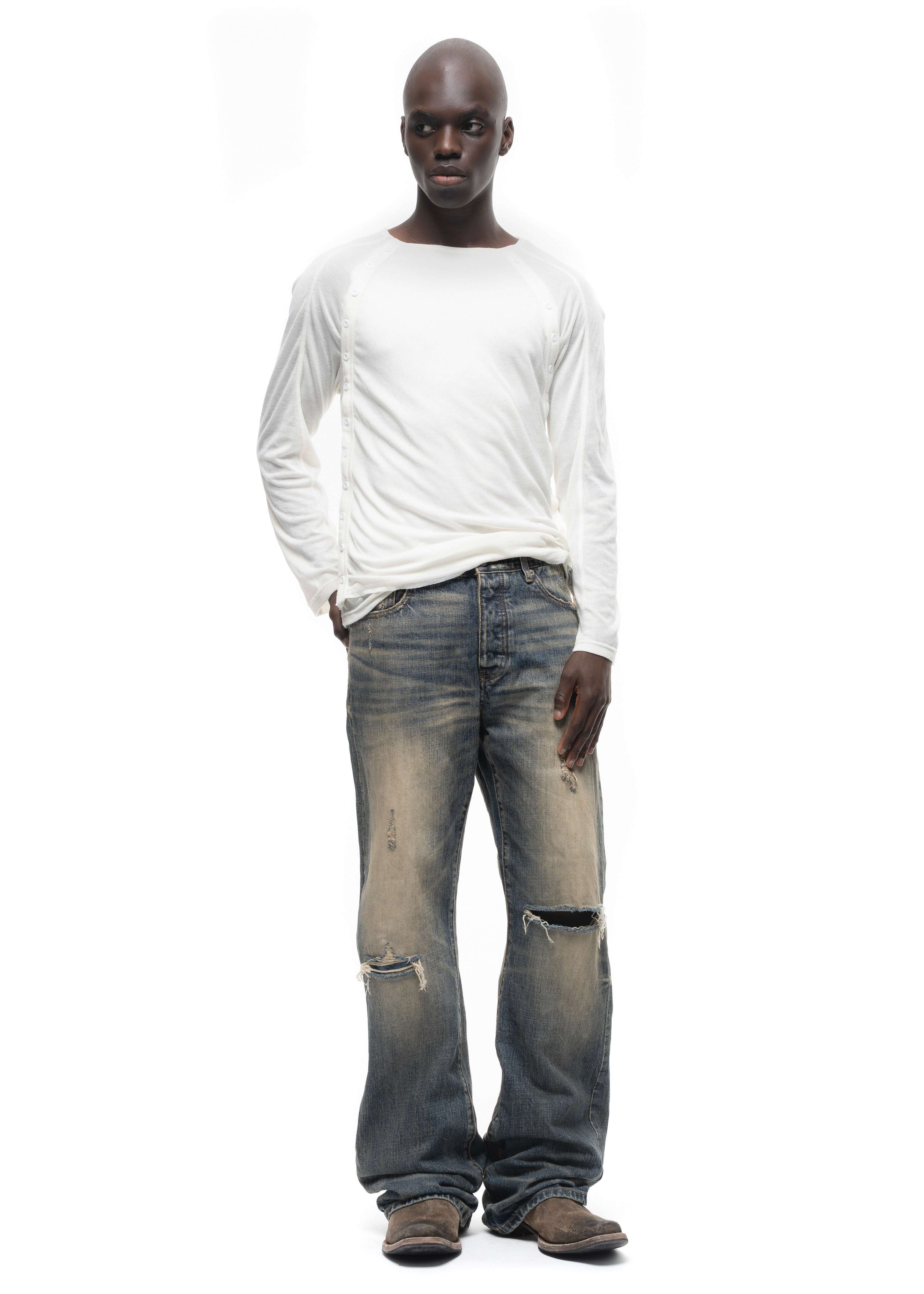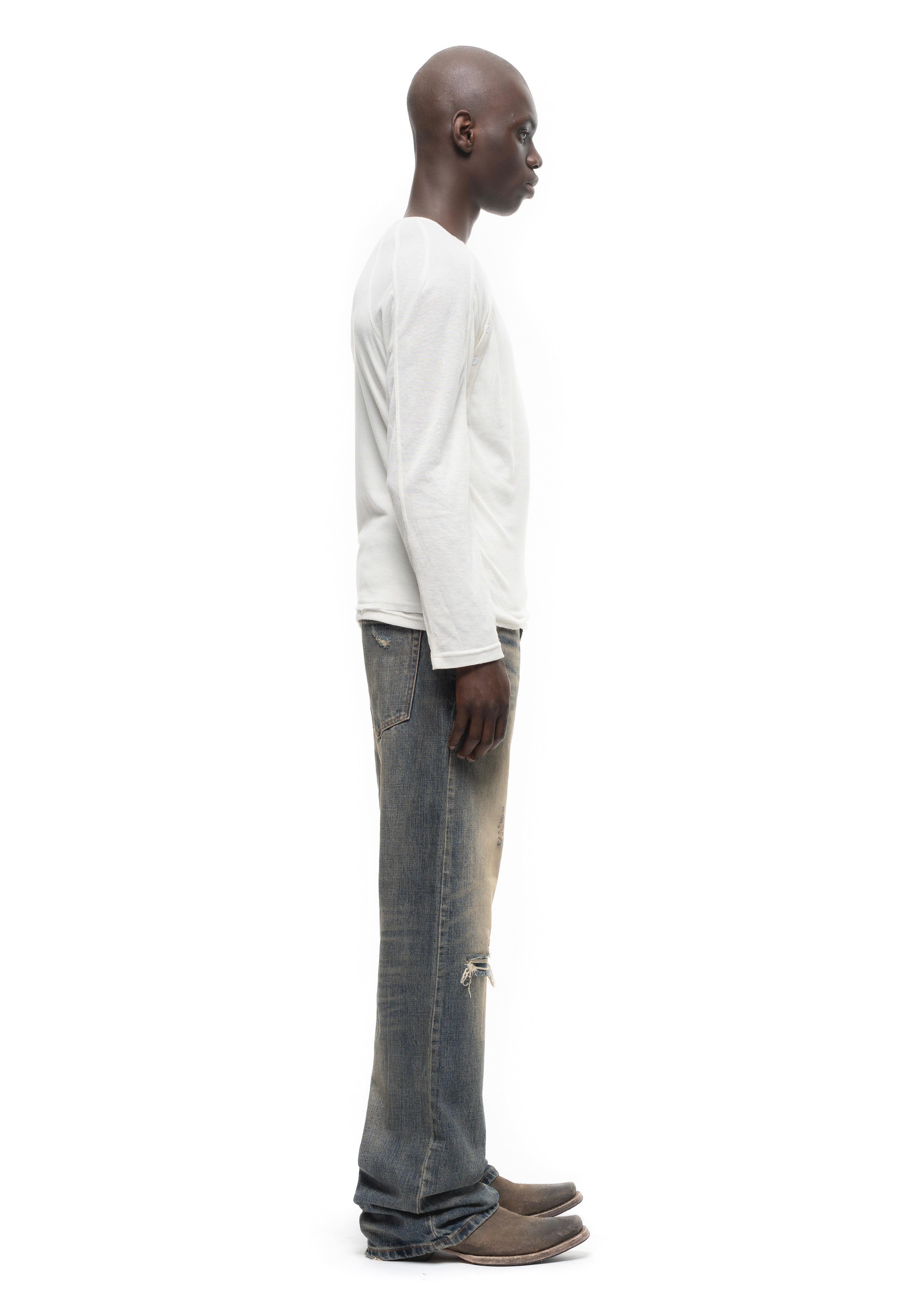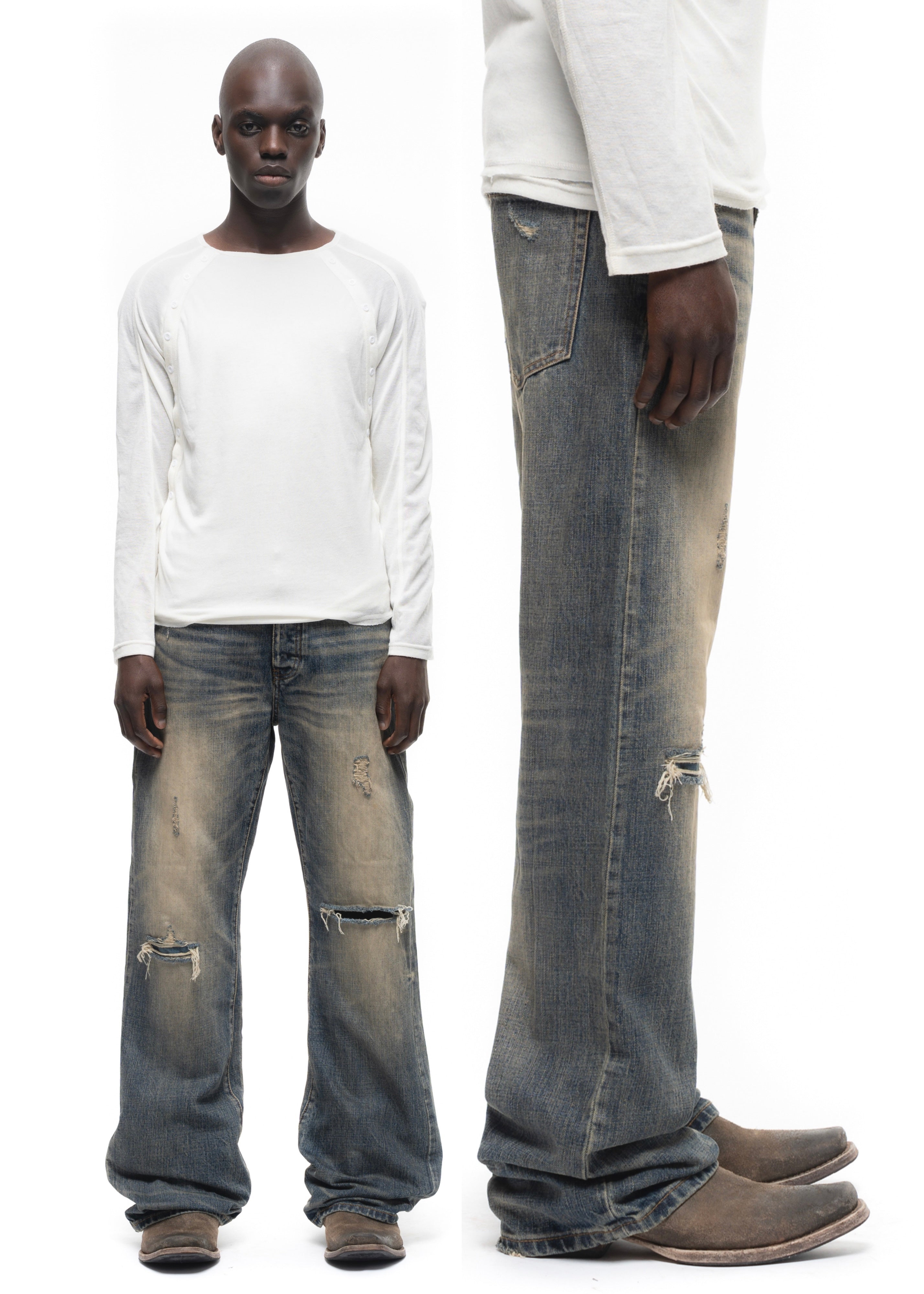 A BOOT CUT DENIM WITH A SUN-FADED WASH THAT HIGHLIGHTS THE THIGHS AND SEAMS. SUBTLE DISTRESSING ADDS DEPTH WHILE MAINTAINING A CLEAN, ELONGATED SHAPE.