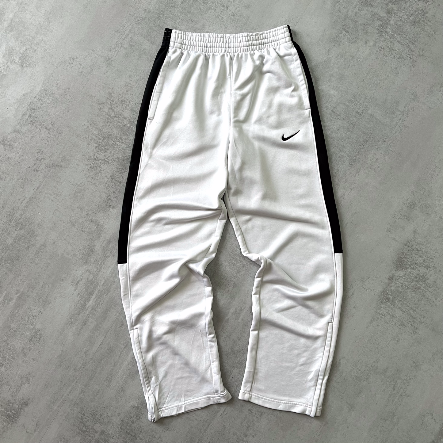 I pantaloni Nike degli anni 2000 rappresentano un'icona di stile sportivo e funzionalità, perfettamente in linea con l'estetica di quel decennio. Realizzati prevalentemente in tessuti tecnici come il nylon o il poliestere, si distinguono per il loro taglio ampio e rilassato, con elastici in vita e alle caviglie che ne accentuano la praticità. Spesso arricchiti da tasche laterali con zip e dettagli riflettenti, questi pantaloni incarnano lo spirito dello streetwear e dell'athleisure di quegli anni. I colori spaziano dal classico nero a tonalità più vivaci, con il logo Nike, ricamato o stampato sulla gamba, che aggiunge un tocco distintivo e riconoscibile.