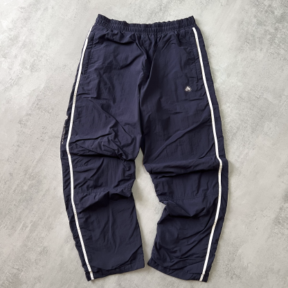 I pantaloni Nike degli anni 2000 rappresentano un'icona di stile sportivo e funzionalità, perfettamente in linea con l'estetica di quel decennio. Realizzati prevalentemente in tessuti tecnici come il nylon o il poliestere, si distinguono per il loro taglio ampio e rilassato, con elastici in vita e alle caviglie che ne accentuano la praticità. Spesso arricchiti da tasche laterali con zip e dettagli riflettenti, questi pantaloni incarnano lo spirito dello streetwear e dell'athleisure di quegli anni. I colori spaziano dal classico nero a tonalità più vivaci, con il logo Nike, ricamato o stampato sulla gamba, che aggiunge un tocco distintivo e riconoscibile.