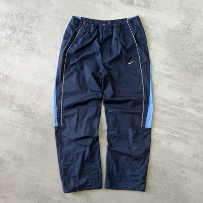 I pantaloni Nike degli anni 2000 rappresentano un'icona di stile sportivo e funzionalità, perfettamente in linea con l'estetica di quel decennio. Realizzati prevalentemente in tessuti tecnici come il nylon o il poliestere, si distinguono per il loro taglio ampio e rilassato, con elastici in vita e alle caviglie che ne accentuano la praticità. Spesso arricchiti da tasche laterali con zip e dettagli riflettenti, questi pantaloni incarnano lo spirito dello streetwear e dell'athleisure di quegli anni. I colori spaziano dal classico nero a tonalità più vivaci, con il logo Nike, ricamato o stampato sulla gamba, che aggiunge un tocco distintivo e riconoscibile.