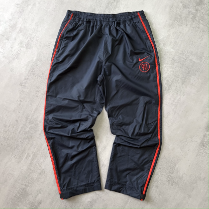 I pantaloni Nike degli anni 2000 rappresentano un'icona di stile sportivo e funzionalità, perfettamente in linea con l'estetica di quel decennio. Realizzati prevalentemente in tessuti tecnici come il nylon o il poliestere, si distinguono per il loro taglio ampio e rilassato, con elastici in vita e alle caviglie che ne accentuano la praticità. Spesso arricchiti da tasche laterali con zip e dettagli riflettenti, questi pantaloni incarnano lo spirito dello streetwear e dell'athleisure di quegli anni. I colori spaziano dal classico nero a tonalità più vivaci, con il logo Nike, ricamato o stampato sulla gamba, che aggiunge un tocco distintivo e riconoscibile.