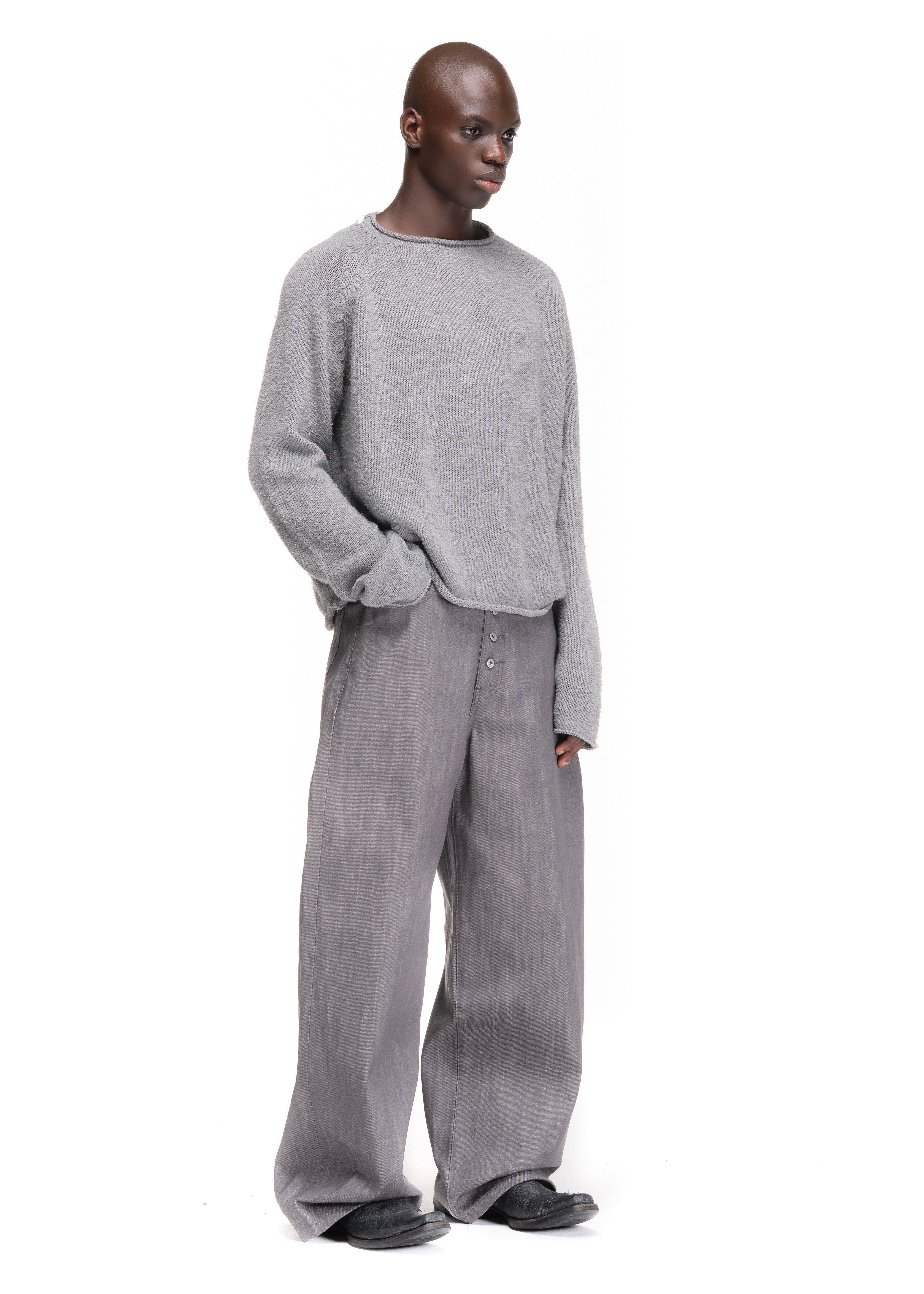 THESE LOOSE-FIT SELVEDGE JEANS ARE MADE FROM AUTHENTIC JAPANESE RAW DENIM IN A GREY VERSION, OFFERING COMFORT AND A RELAXED SILHOUETTE. THE VISIBLE BUTTON FLY ADDS A STRONGER VINTAGE CHARACTER, LINKING BACK TO THE ORIGINAL CLOSURE STYLE OF EARLY JEANS.
