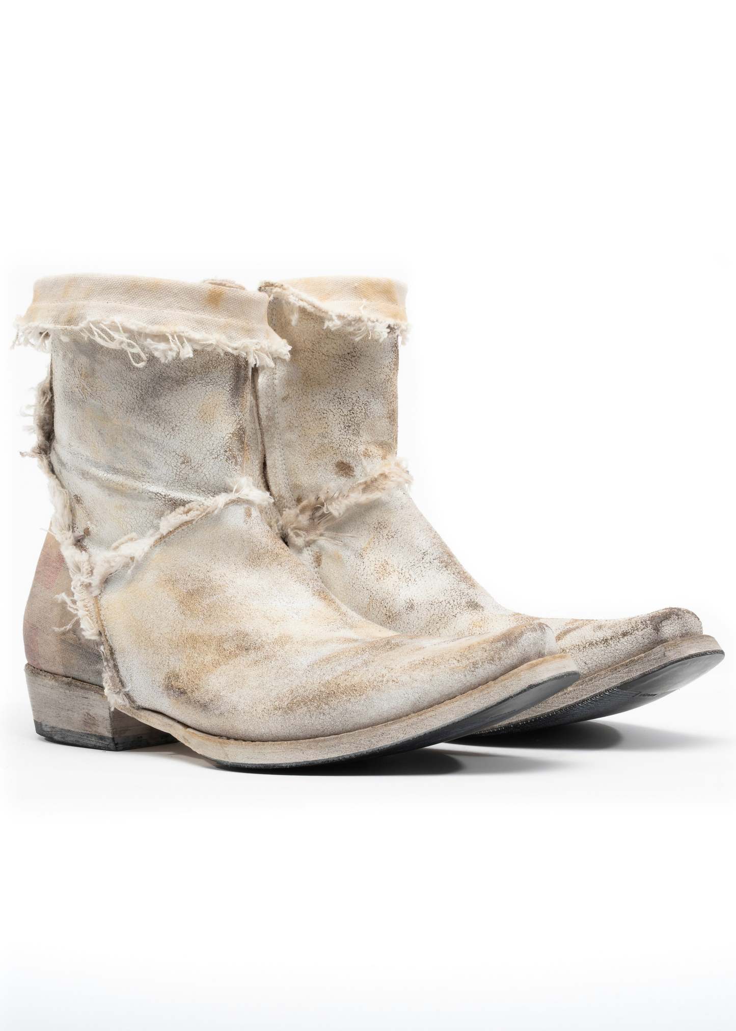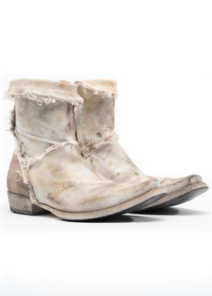 BEIGE GRAINED LEATHER WITH A NATURALLY FADED AND SLIGHTLY WORN SURFACE. STRAIGHT SHAFT, BROAD SQUARE TOE, LOW STACKED HEEL. A DISTRESSED CANVAS PATCH WITH A PRINTED SAARLAND FLAG IS ATTACHED TO THE BACK HEEL. HANDMADE IN ITALY.