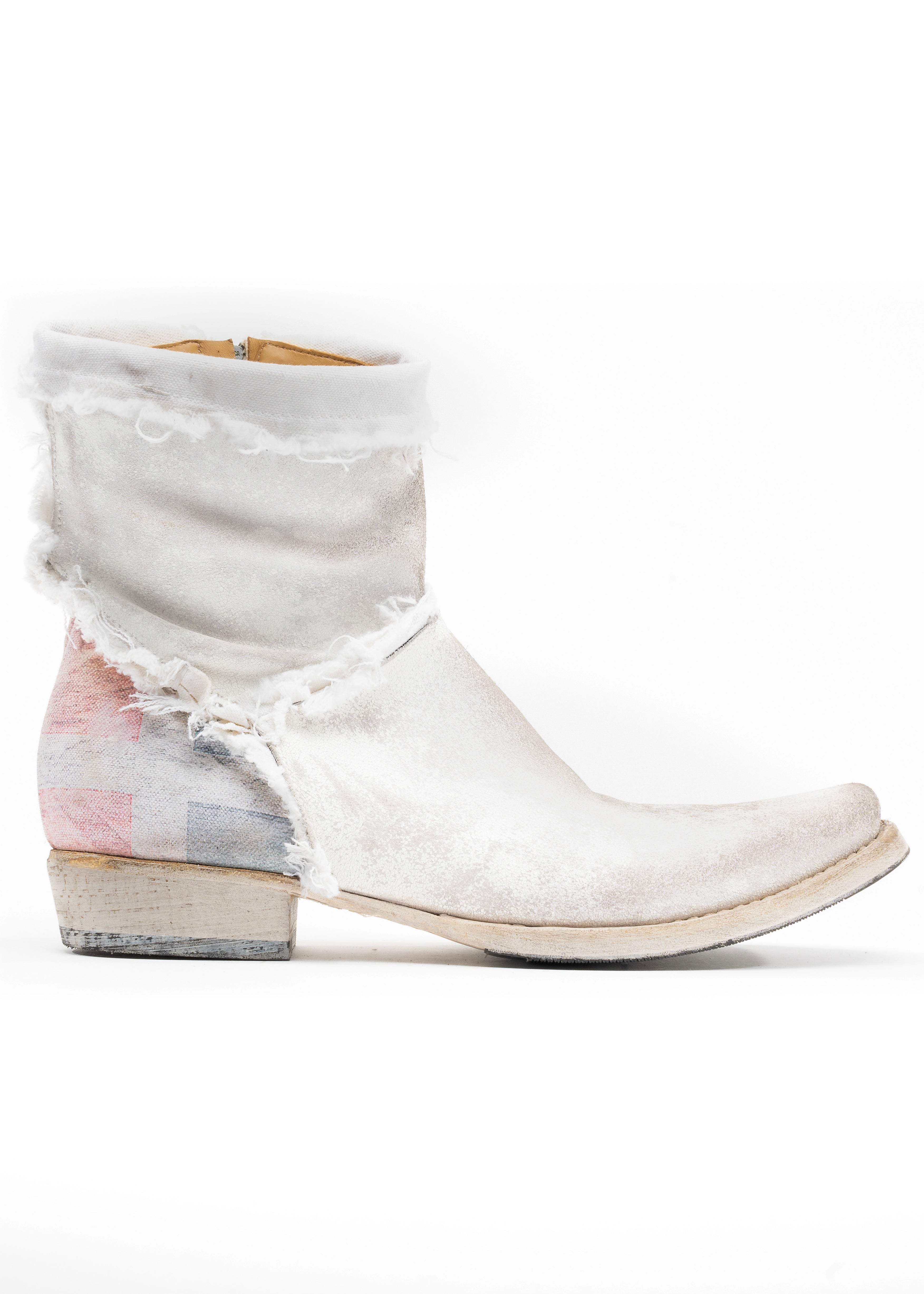 WHITE GRAINED LEATHER WITH A NATURALLY FADED AND SLIGHTLY WORN SURFACE. STRAIGHT SHAFT, BROAD SQUARE TOE, LOW STACKED HEEL. A DISTRESSED CANVAS PATCH WITH A PRINTED SAARLAND FLAG IS ATTACHED TO THE BACK HEEL. HANDMADE IN ITALY.