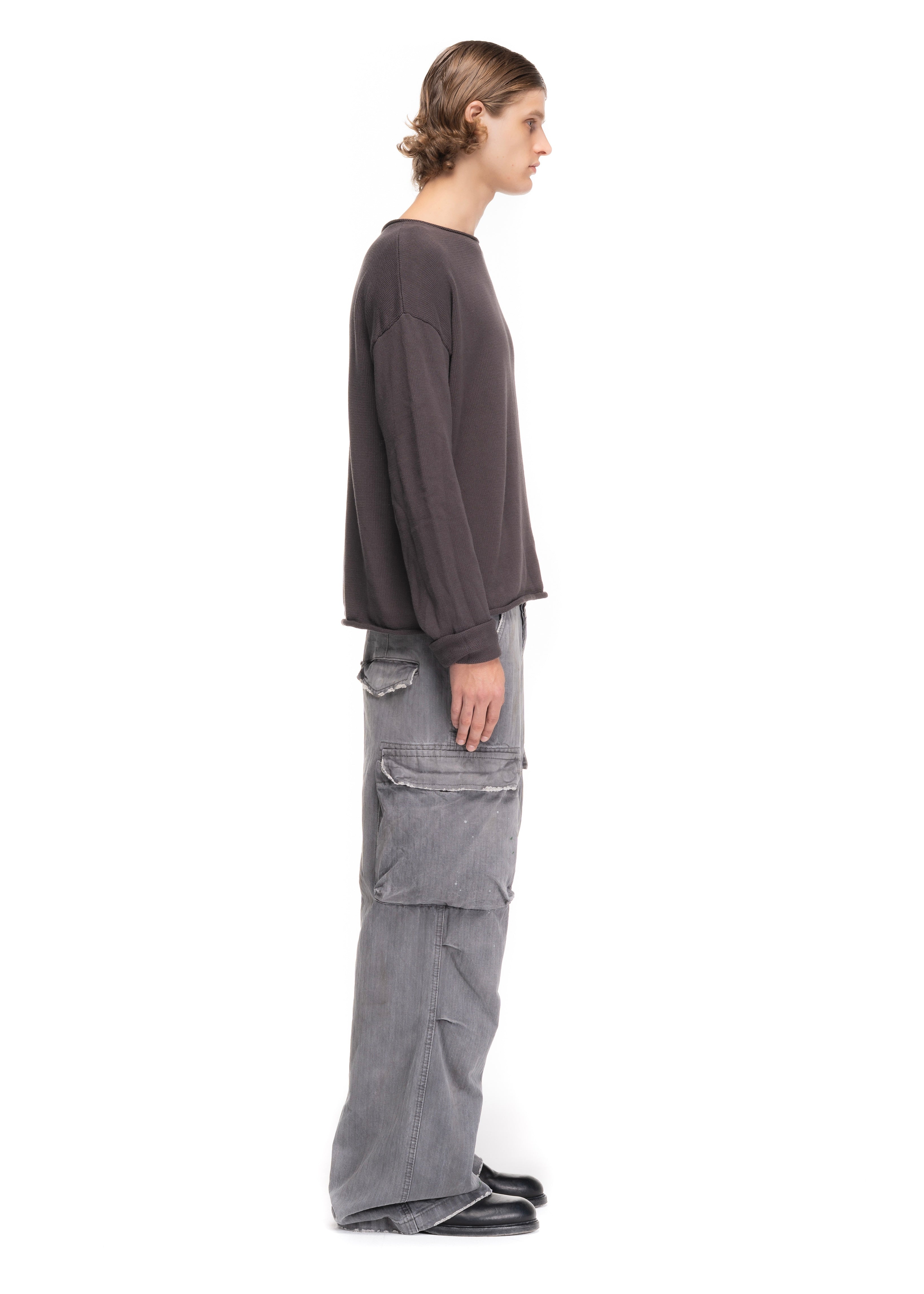 THESE CLASSIC CARGO-POCKET PANTS ARE CRAFTED FROM DURABLE HERRINGBONE CANVAS IN A DISTINCT GREY SHADE. DESIGNED IN A LOOSE-FIT SILHOUETTE, THEY FEATURE STRATEGIC KNEE DARTS THAT SUBTLY MANIPULATE THE FIT, ENHANCING VOLUME AND SHAPE. JAPANESE-INSPIRED PATCHES AT THE KNEES ADD AN EXTRA LAYER OF DETAIL, REINFORCING THE WORKWEAR CHARACTER WHILE GIVING THE PANTS A UNIQUE TEXTURAL DIMENSION.