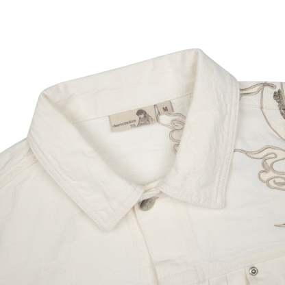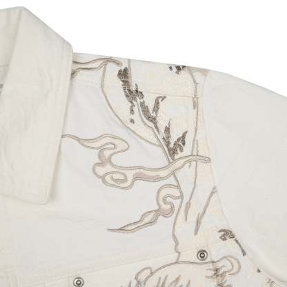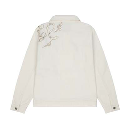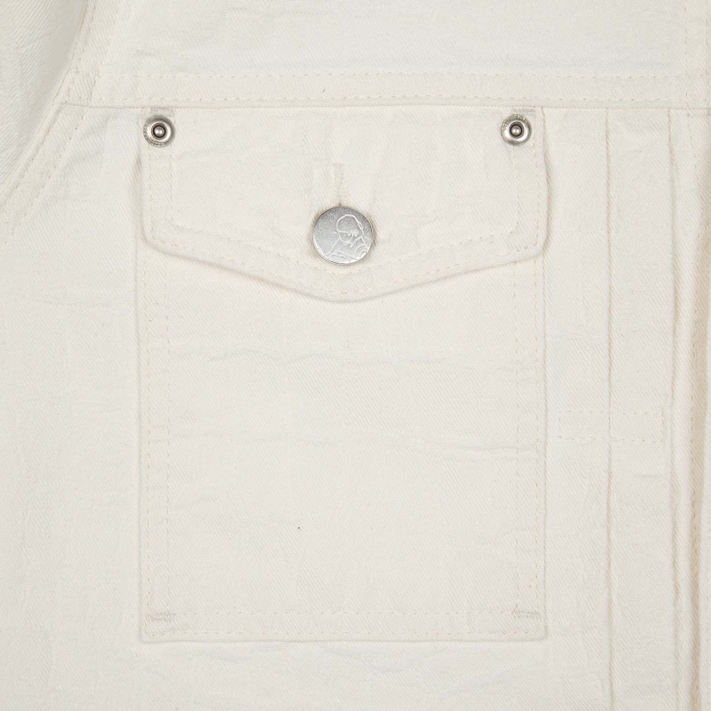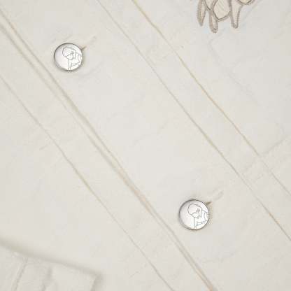 13oz jacquard patterned denim / 100% cotton / embroidery on front and back / custom buttons / fits true to size