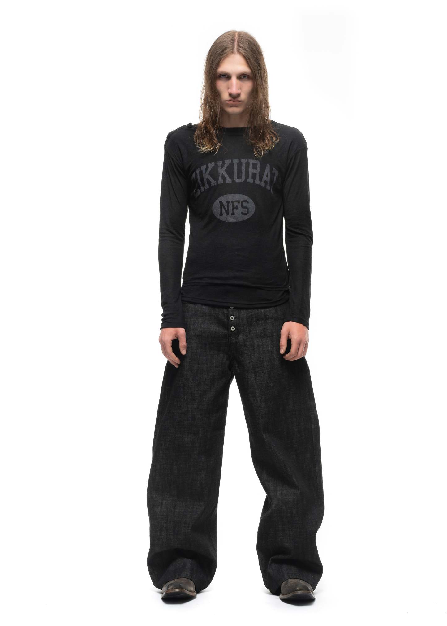 A LONGSLEEVE THAT PLAYS WITH LAYERING AND VISUAL DEPTH. THE BASE LAYER FEATURES A ZIKKURAT NFS PRINT, SUBTLY VISIBLE THROUGH THE LIGHTWEIGHT COTTON SHELL. A SHOULDER BUTTON DETAIL COMPLETES THE DESIGN.