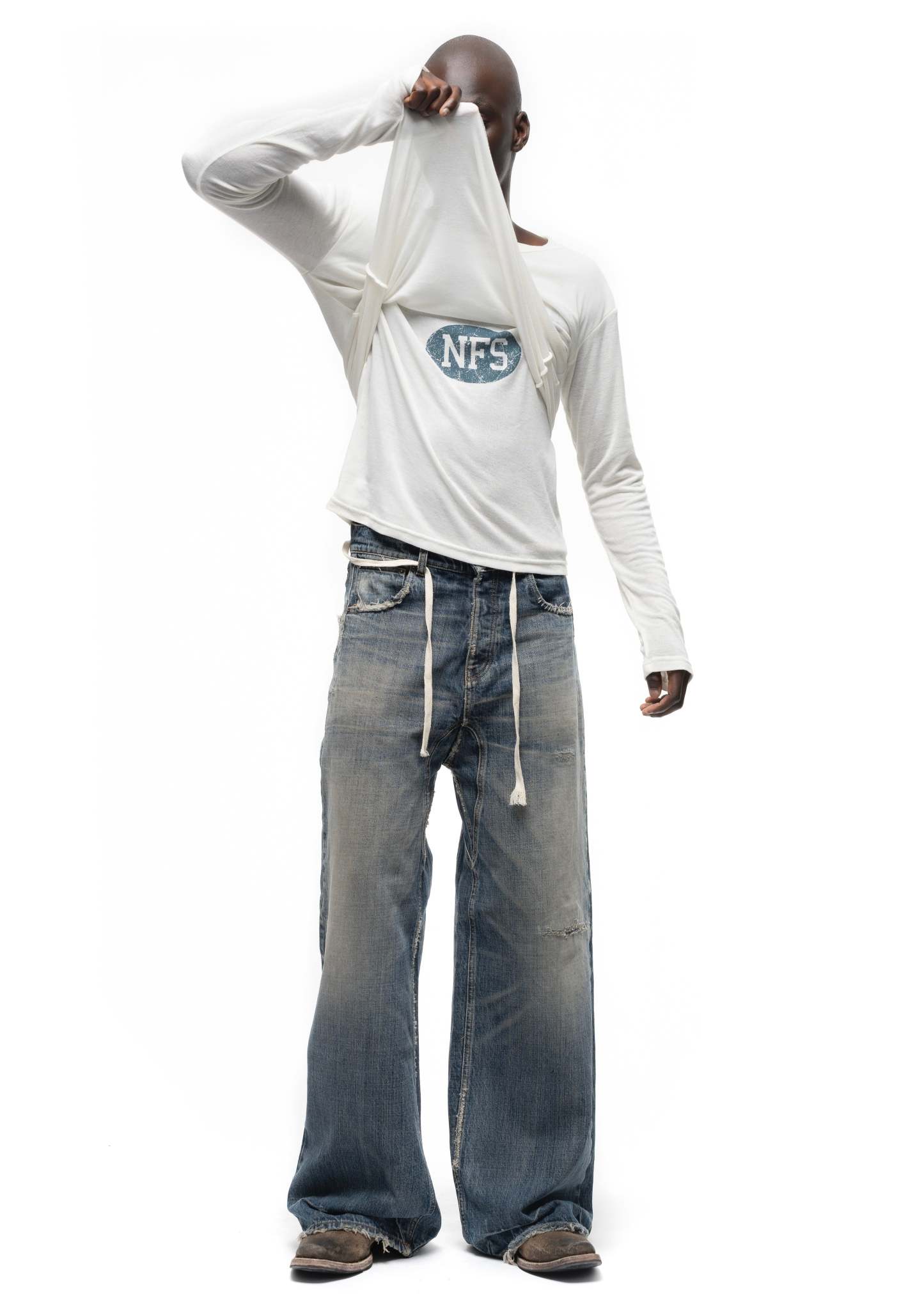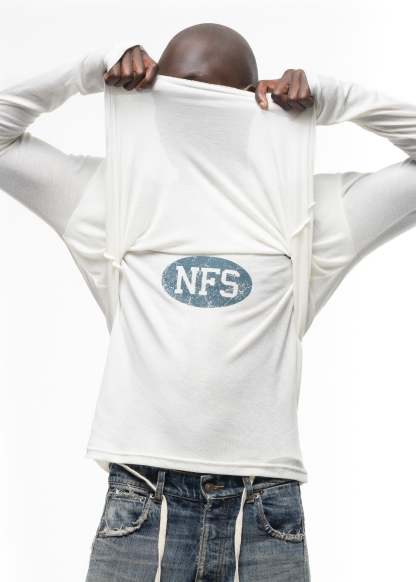 A LONGSLEEVE THAT PLAYS WITH LAYERING AND VISUAL DEPTH. THE BASE LAYER FEATURES A ZIKKURAT NFS PRINT, SUBTLY VISIBLE THROUGH THE LIGHTWEIGHT COTTON SHELL. A SHOULDER BUTTON DETAIL COMPLETES THE DESIGN.